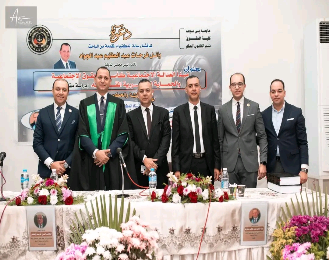 ناقش الباحث والمستشار وائل فرحات عبد العظيم عبد الجـواد، نائب رئيس مجلس الدولة، رسالة بحثية لنيل درجة الدكتوراه في القانون، وذلك بكلية الحقوق جامعة بني سويف، تحت عنوان "مبدأ العـدالة الاجتماعية كأساس للحقوق الاجتماعية والحمــاية الدستورية المقررة لــه (دراسة مقارنة)".