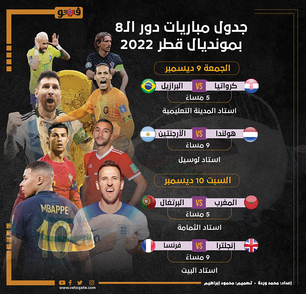 كأس العالم 2022، مواعيد مباريات دور الـ8 بمونديال قطر الثلاثاء 06/ديسمبر/2022 - 10:55 م 12/6/2022 10:55:40 PM مباريات كأس العالم ،فيتو شارك طباعة 18 حجم الخط شارك طباعة مواعيد مباريات كأس العالم 2022 مونديال قطر كأس العالم دور الـ8