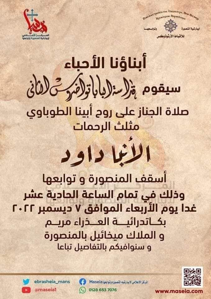 ومن المقرر أن يقوم قداسة البابا تواضروس الثاني بصلاة الجنازة على روح نيافة الحبر الجليل الأنبا داوود أسقف المنصورة وتوابعها.