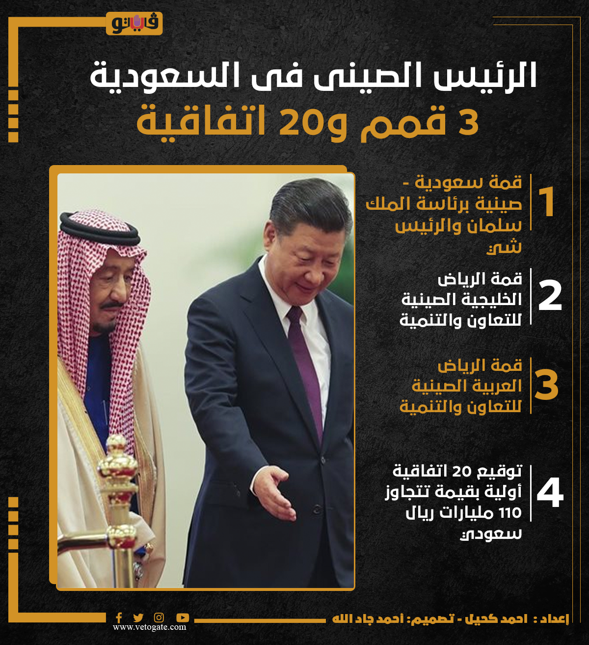 الرئيس الصينى فى السعودية، 3 قمم و20 اتفاقية إنفوجراف الأربعاء 07/ديسمبر/2022 - 02:50 م 12/7/2022 2:50:20 PM العاهل السعودى والرئيس الصينى،فيتو شارك طباعة 18 حجم الخط شارك طباعة الصين الرئيس الصينى فى السعودية القمة العربية الصينية