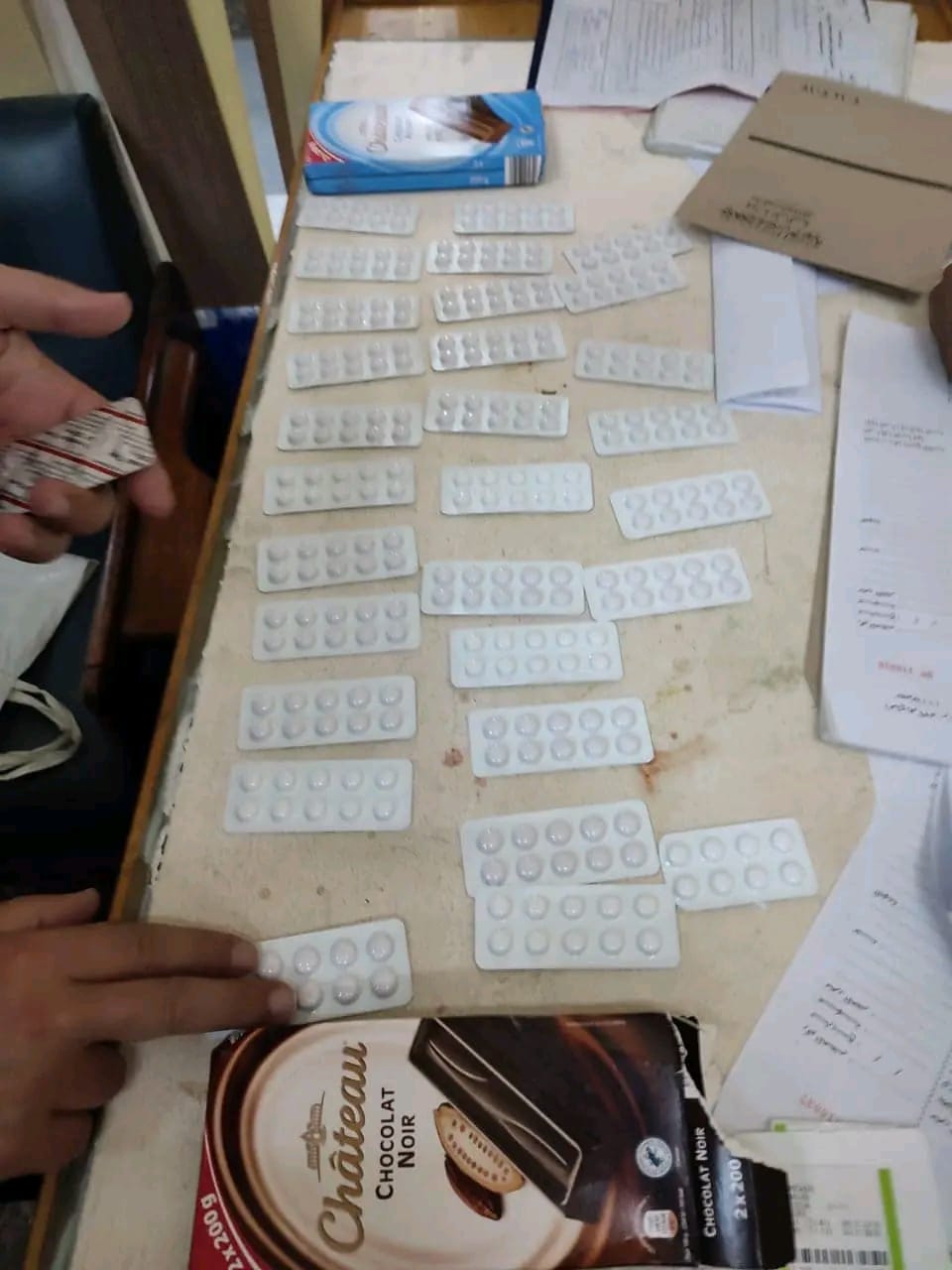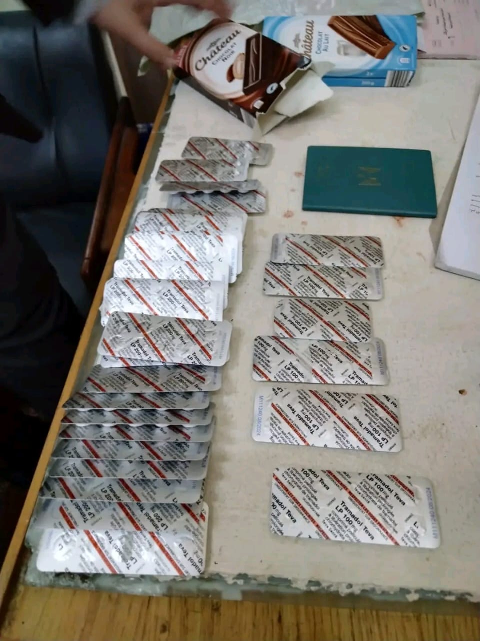 و بالعرض على علاء علي شحاته مدير الحركة المشرف على صالة الوصول قام بتكليف أحمد إبراهيم مأمور الجمرك بتفتيش حقائب الراكب فتبين وجود ٣٠ شريط من عقار الترامادول المخدر مخبأة داخل علب شيكولاته بين طيات الملابس بحقائب الراكب.