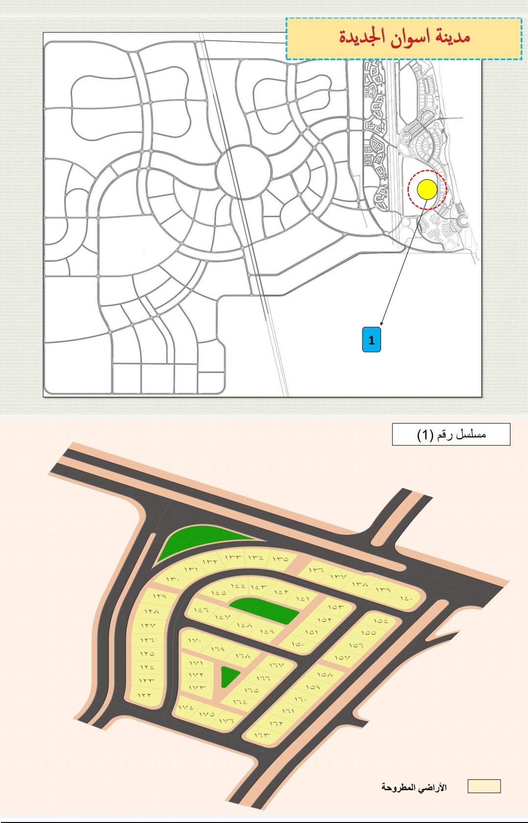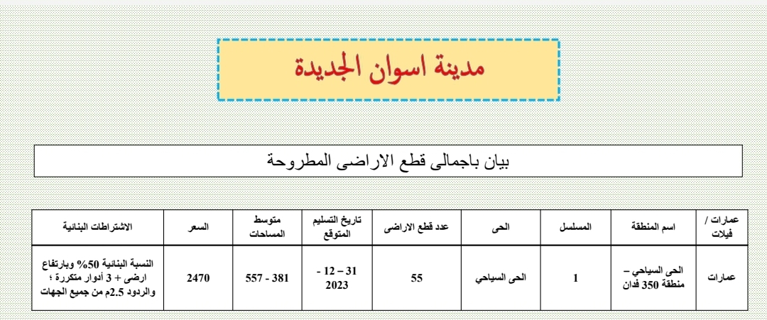 تم طرح ٥٥ أرضا بالحي السياحي منطقة ٣٥٠ فدان بمدينة أسوان الجديدة ومتوسط المساحات من ٣٨١ الى ٥٥٧ متر مربع والسعر ٢٤٧٠ جنيها للمتر وعن الاشتراطات البنائية: النسبة البنائية ٥٠% وبارتفاع أرضي و٣ أدوار متكررة والردود ٢.٥ متر مربع من جميع الجهات