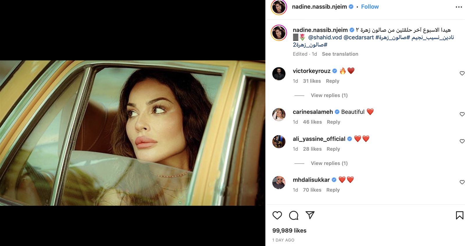 شوقت الفنانة اللبنانية نادين نسيب نجيم الجمهور للحلقات الأخيرة من مسلسل صالون زهرة حيث نشرت عبر حسابها الرسمي على موقع تبادل الصور إنستجرام صورة لها وأرفقت تعليق “هذا الأسبوع آخر حلقتين من صالون زهرة 2 🥹🌷 #نادين_نسيب_نجيم #صالون_زهرة #صالون_زهرة 2”.