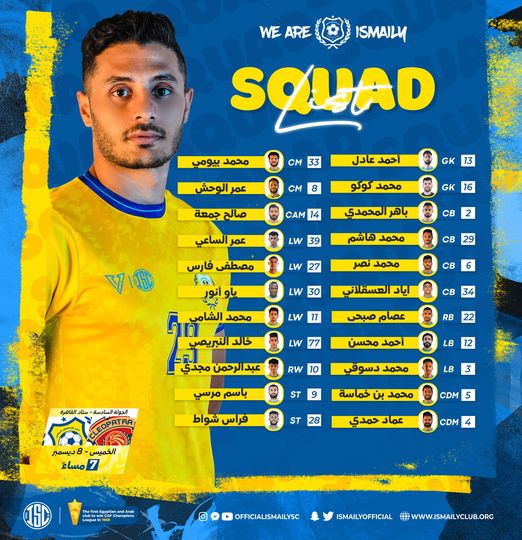 وكان الجهاز الطبي لفريق الكرة الأول بالنادي الإسماعيلي، برئاسة الدكتور مجدي الباز، أعلن قائمة المصابين التي ستغيب عن مواجهة الغد، أمام سيراميكا كليوباترا ضمن منافسات الدوري العام.