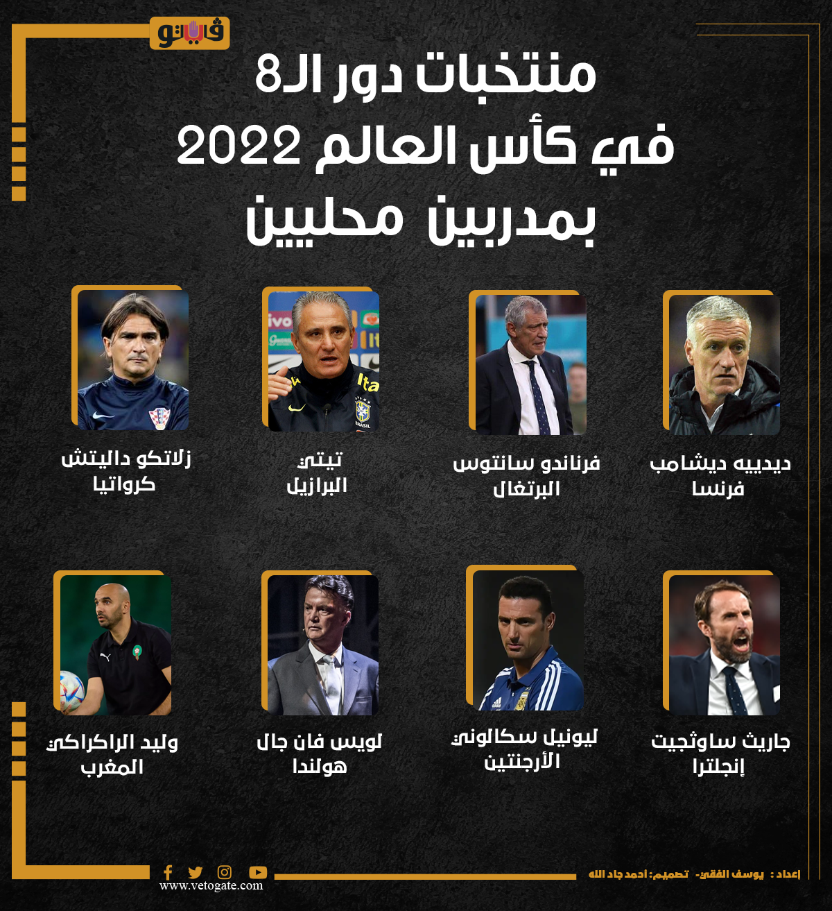 منتخبات دور الـ8 في كأس العالم 2022 بمدربين محليين| انفوجراف الخميس 08/ديسمبر/2022 - 10:21 م 12/8/2022 10:21:41 PM الركراكي، فيتو يوسف الفقي شارك طباعة 18 حجم الخط شارك طباعة ديشامب منتخب البرازيل منتخب كرواتيا ساوثجيت كأس العالم