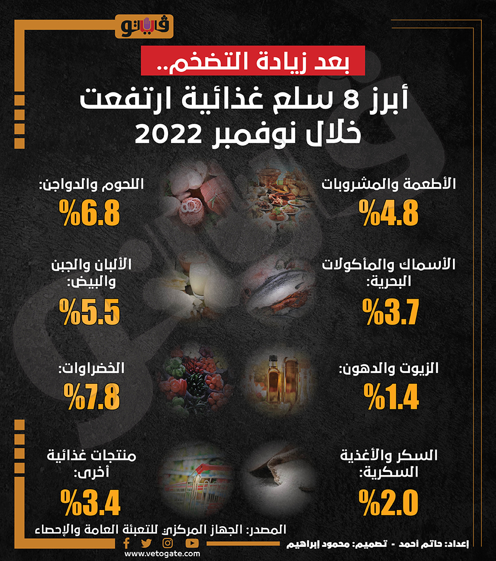 بعد زيادة التضخم.. أبرز 8 سلع غذائية ارتفعت خلال نوفمبر 2022 إنفوجراف الخميس 08/ديسمبر/2022 - 01:44 م 12/8/2022 1:44:50 PM ارتفاع معدلات التضخم حاتم أحمد شارك طباعة 18 حجم الخط شارك طباعة التضخم أسباب ارتفاع التضخم الإحصاء اسعار السلع اللحوم والدواجن الجهاز المركزى للتعبئة العامة والإحصاء