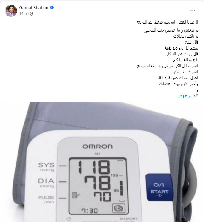 وكتب الدكتور جمال شعبان تدوينة على الفيس بوك: "الوصايا العشر لمريض ضغط الدم المرتفع.. ما تدخنش وما تقعدش جنب المدخنين، ما تاكلش مخللات قلل الملح، تمشي كل يوم ٤٥ دقيقة".