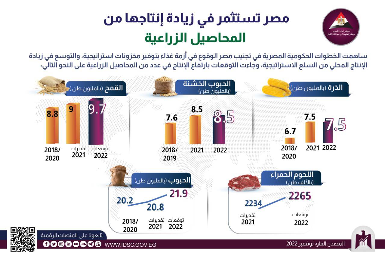 معلومات الوزراء: مصر تستثمر في زيادة إنتاجها من المحاصيل إنفوجراف