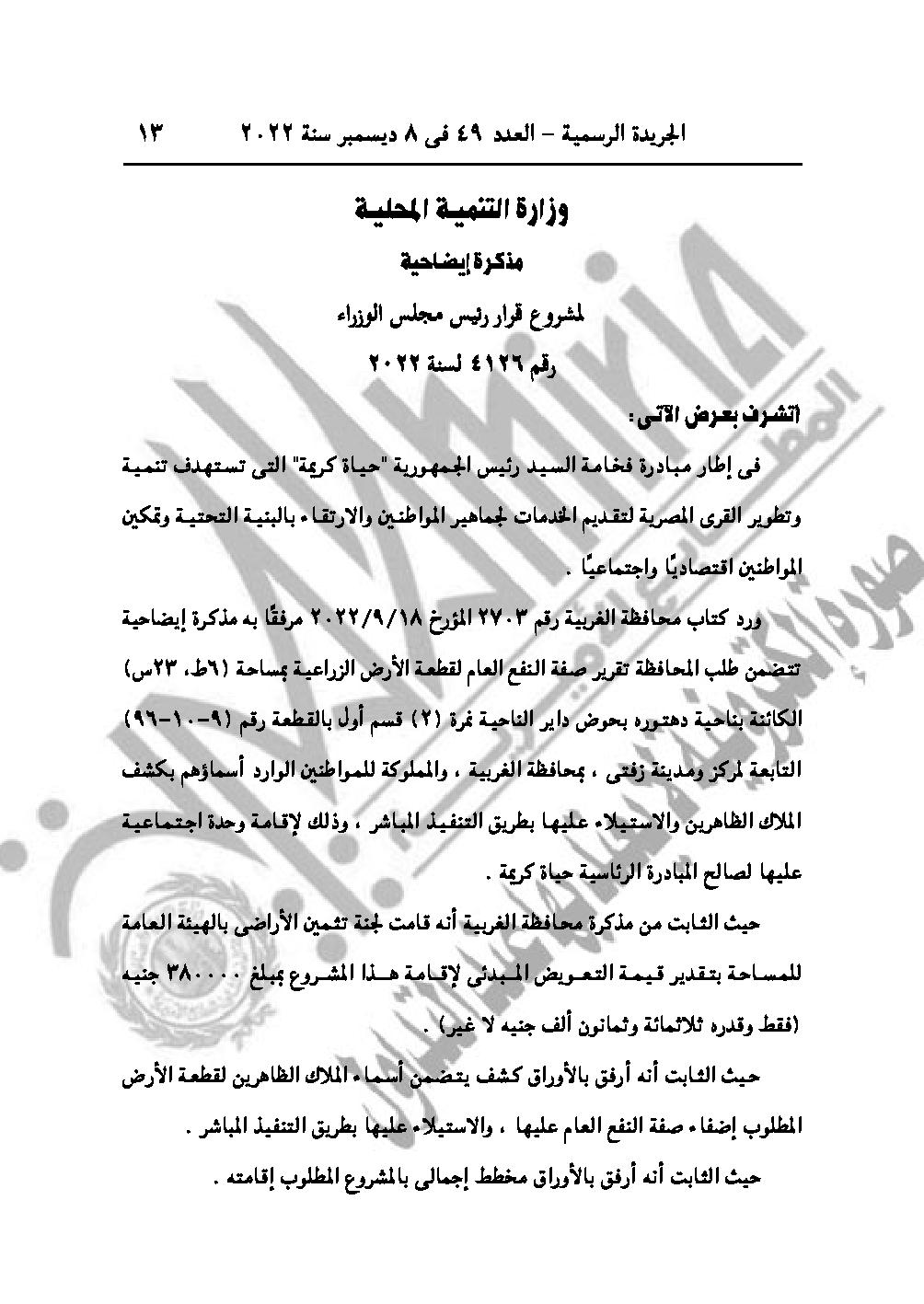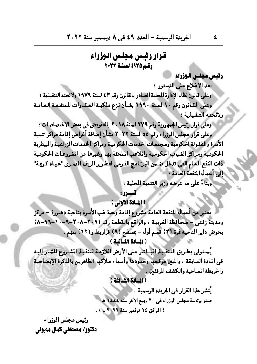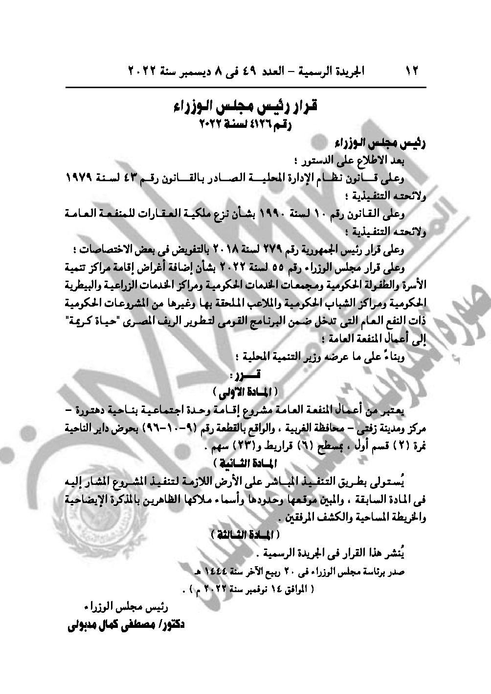 -وقرار رئيس الوزراء رقم 4126 لسنة 2022، باعتبار مشروع إقامة وحدة اجتماعية بناحية دهتورة، مركز زفتى محافظة الغربية، من أعمال المنفعة العامة.