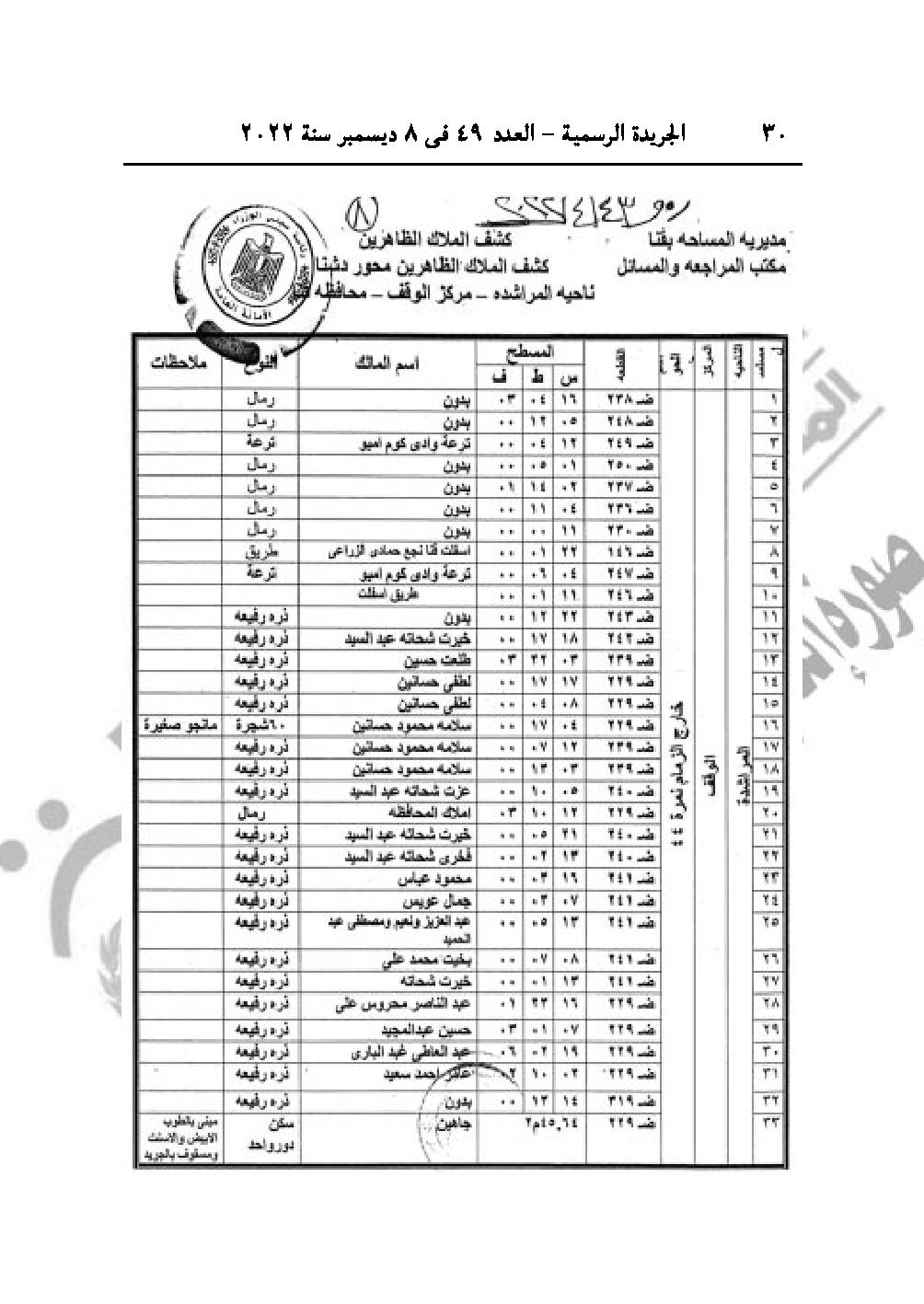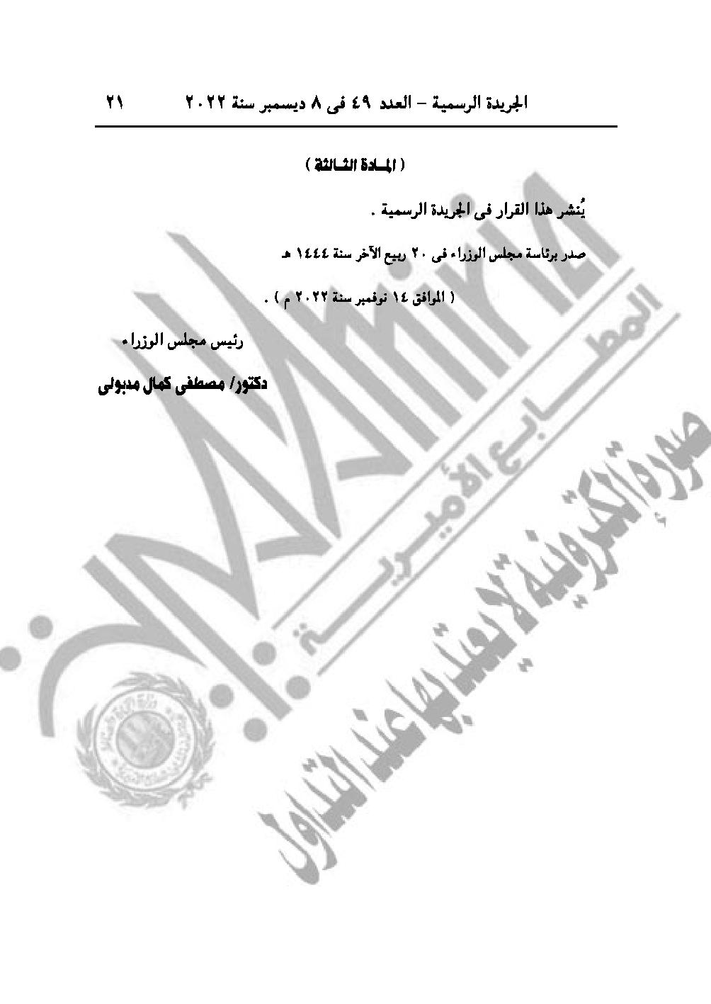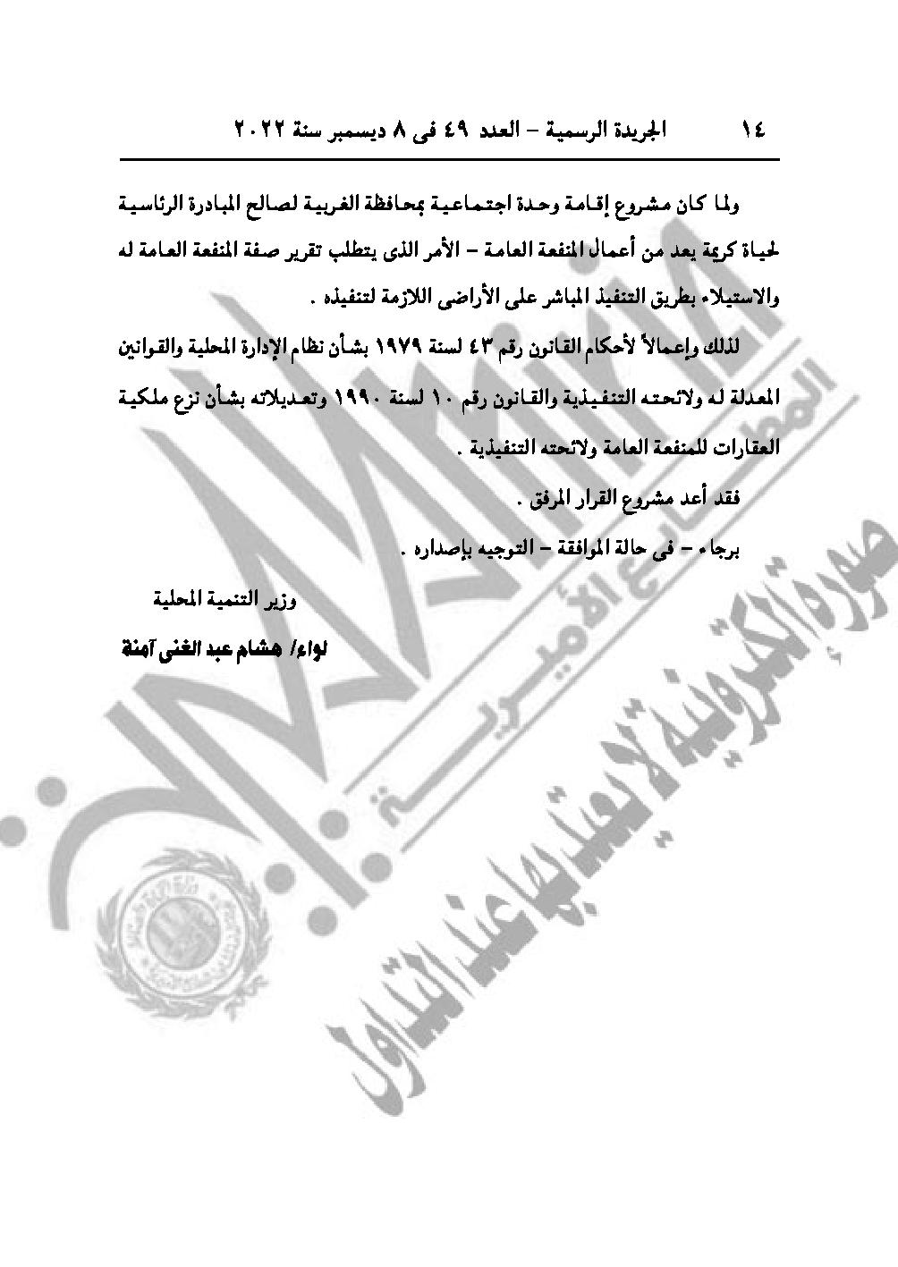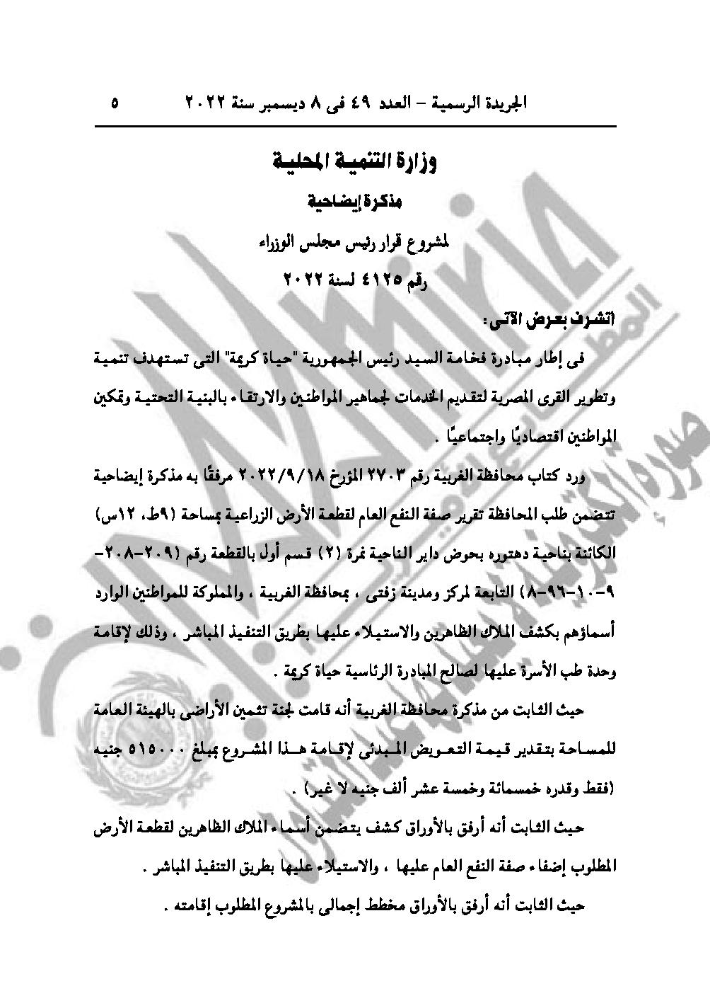 -وقرار رئيس الوزراء رقم 4126 لسنة 2022، باعتبار مشروع إقامة وحدة اجتماعية بناحية دهتورة، مركز زفتى محافظة الغربية، من أعمال المنفعة العامة.