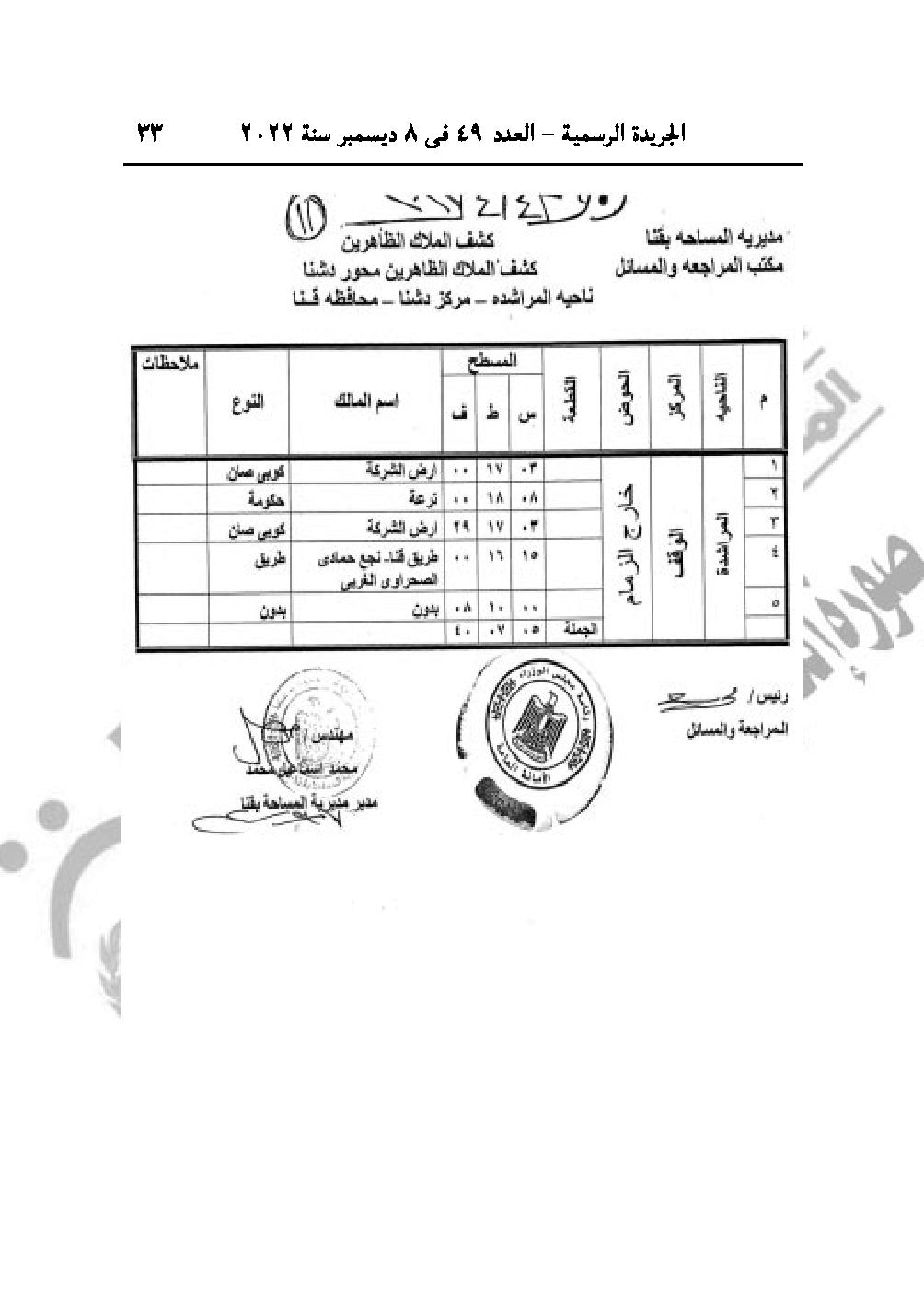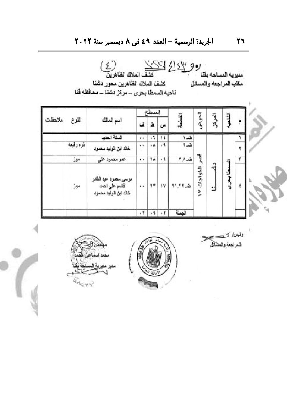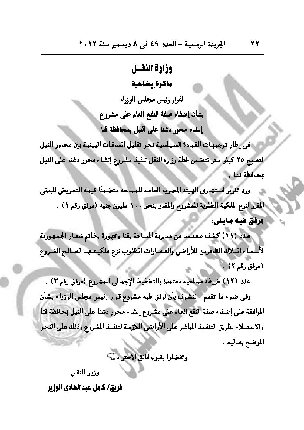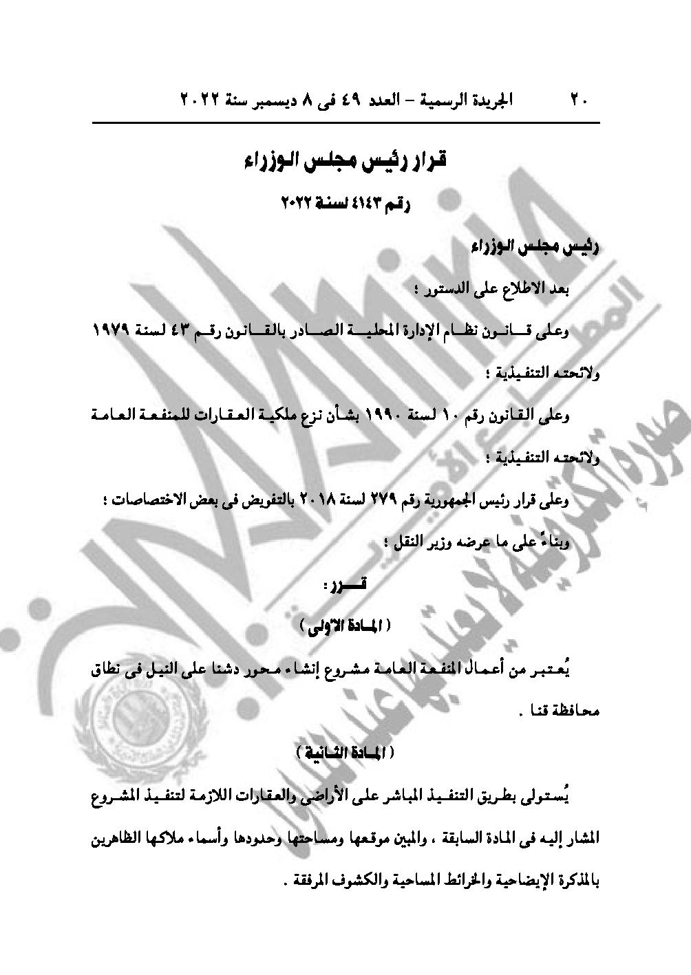 -وقرار رقم 4143 لسنة 2022، باعتبار مشروع إنشاء محور دشنا على النيل في نطاق محافظة قنا، من أعمال المنفعة العامة.
