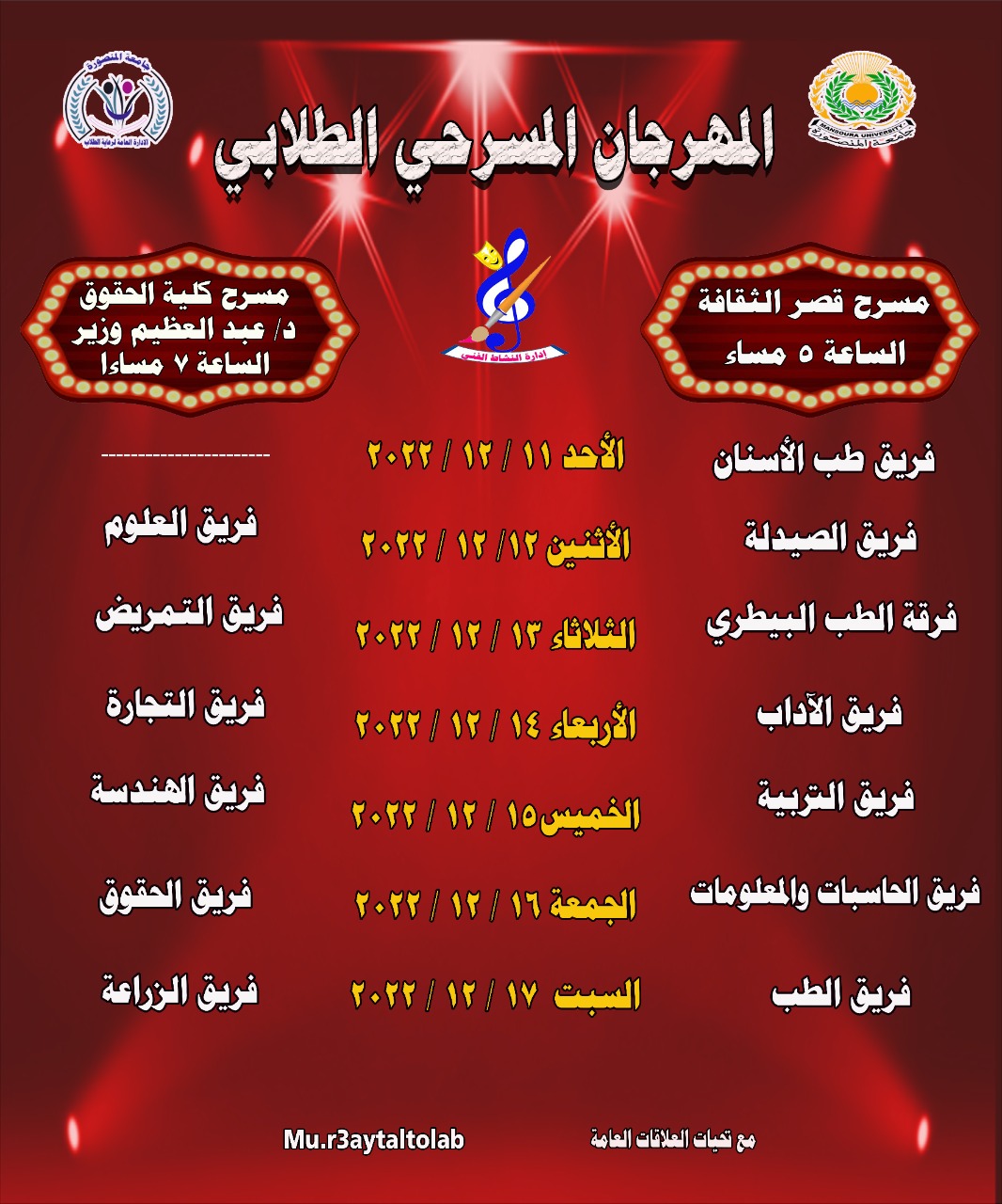 الجدير بالذكر أنه يشارك ضمن فعاليات المهرجان المسرحى 13 فريق مسرحى لمختلف كليات الجامعة وذلك خلال الفترة من 11 حتى 17 ديسمبر 2022 وستعرض الأعمال المسرحية على مسرح عبد العظيم وزير بكلية الحقوق بالجامعة، مسرح وزارة الثقافة بالمنصورة، كما يقوم بتحكيم الأعمال المسرحية كل من باسم صادق الناقد المسرحى والصحفى، أحمد شوقى مرعى مدرس ديكور مسرحى بالمعهد العالى للفنون المسرحية، الفنان علاء حسنى مدرس مساعد بالمعهد العالى للفنون المسرحية.