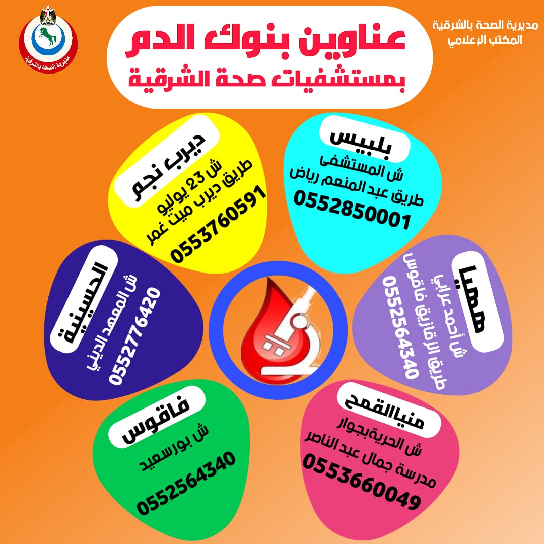 وأشارت الدكتورة المتحدث الرسمى عن صحة الشرقية أنه تم الإعلان عن بنوك الدم بمراكز المحافظة، وذلك فى بلبيس بشارع المستشفى طريق عبد المنعم رياض والتواصل على ت 0552850001 وفى مركز ديرب شارع 23يوليو طريق ديرب ميت غمر ت-0553760951 وفى مركز الحسينية بشارع المعهد الدينى -ت-0552776420 اما بفاقوس فيوجد المركز فى شارع بورسعيد -ت-0552564340 وفى مركز ههيا يوجد بنك الدم بشارع احمد عرابى طريق الزقازيق فاقوس و-ت- 0552564340أما فى منيا القمح فيوجد بنك الدم فى شارع الحرية بجوار مدرسة جمال عبد الناصر وتليفون 0553660049