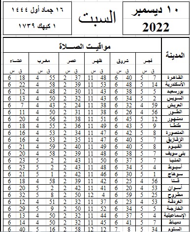 مواقيت الصلاة، مواقيت الصلاة اليوم السبت 10- 12 - 2022 في القاهرة والمحافظات