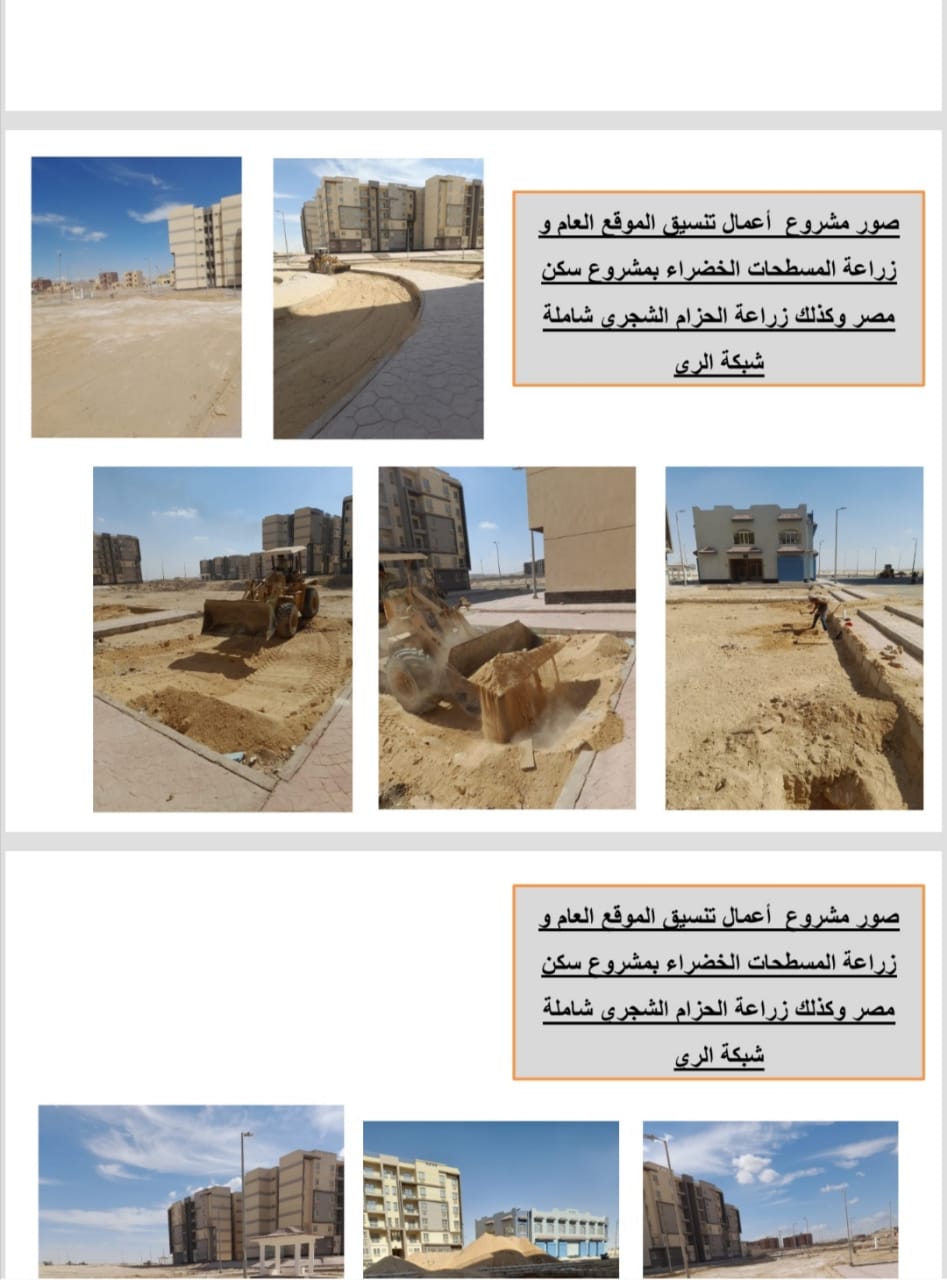 وأشار رئيس الجهاز إلى أنه جارٍ تنفيذ أعمال خط طرد لنقل المياه العكرة قطر 800 مم من الزهر المرن بطول 400 متر والمغذى لمحطة تنقية المياه الدائمة، بجانب تنفيذ أعمال تنسيق الموقع العام وزراعة المسطحات الخضراء بمشروع سكن مصر، وكذا أعمال زراعة الحزام الشجري شاملة شبكة الري، وجارٍ تنفيذ زراعة الممشى السياحي أمام الحي الخامس والمتبقي من الأحياء الثاني والثالث والرابع.