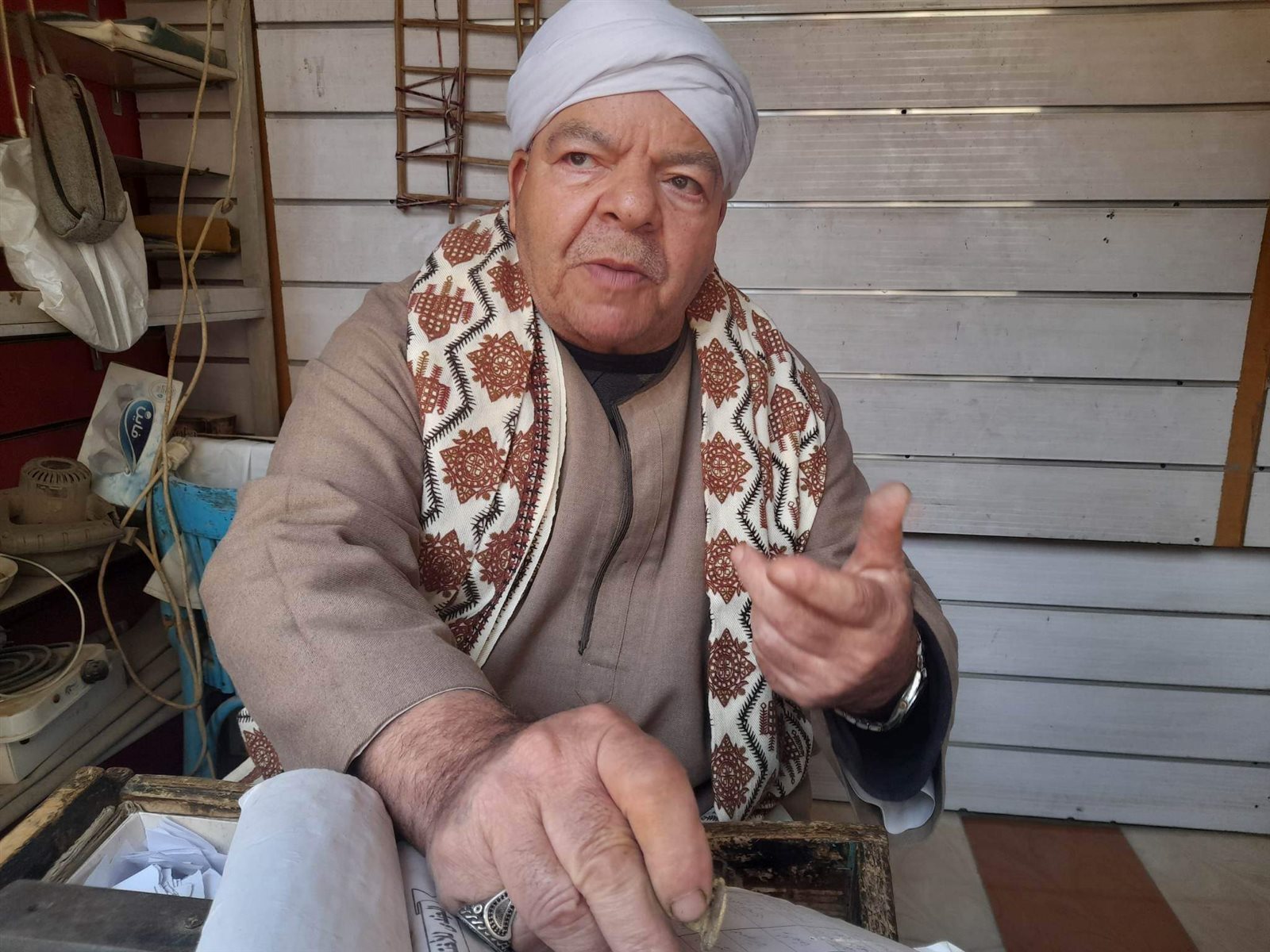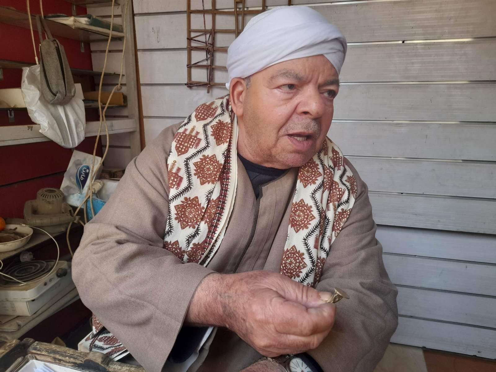 يخطف أنظارك « الحاج أحمد الجندي» الرجل الستيني، هو جالسًا على كرسي خشبي أمام مكتب خشبي الصنع وصندوق مليئ بالاختام النحاسية.