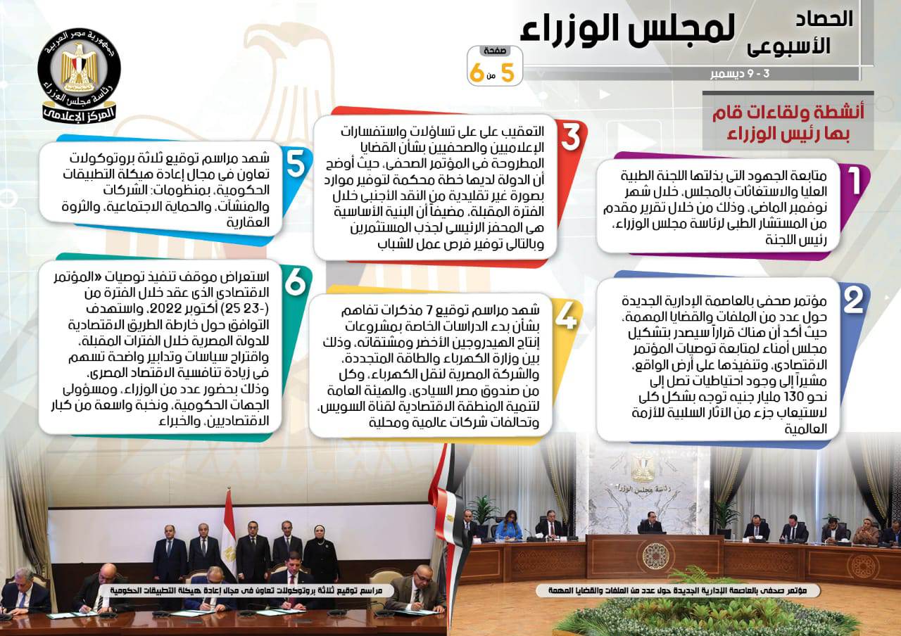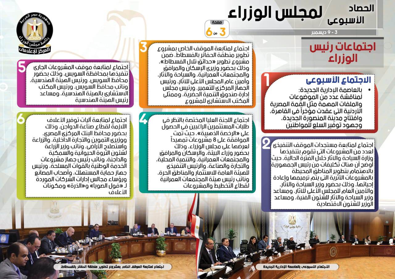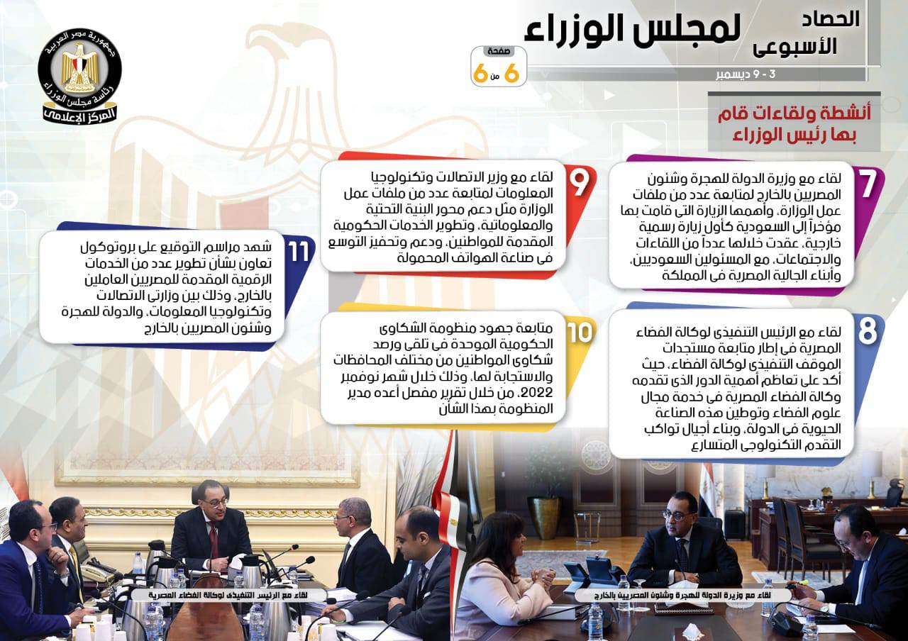 نشر المركز الإعلامي لمجلس الوزراء، تقريرًا شمل إنفوجرافات سلط من خلالها الضوء على الحصاد الأسبوعي لمجلس الوزراء، وذلك خلال الفترة من 3 حتى 9 ديسمبر 2022، والذي تضمن الموافقة على عدد من القرارات، فضلًا عن الاجتماعات واللقاءات التي عقدها الدكتور مصطفى مدبولي، رئيس مجلس الوزراء، بالإضافة إلى ما قام به من أنشطة.