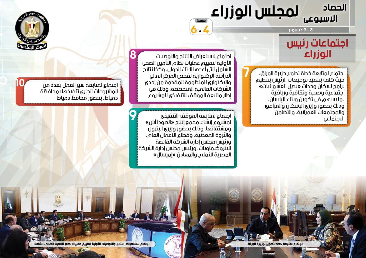 كما شملت الاجتماعات أيضًا وفقًا للتقرير، اجتماعًا لمتابعة خطة تطوير جزيرة الوراق، حيث كلف بتنفيذ توجيهات الرئيس بتنظيم برامج لسكان وحدات "بديل العشوائيات" اجتماعية وصحية وثقافية ورياضية بما يسهم فى تكوين وبناء الإنسان، وذلك بحضور وزيرى الإسكان والمرافق والمجتمعات العمرانية، والتضامن الاجتماعى، كما ترأس (مدبولي) الاجتماع الأسبوعي بالعاصمة الإدارية الجديدة لمناقشة عدد من الموضوعات والملفات المهمة مثل القمة المصرية الأردنية التي عقدت مؤخرًا في القاهرة، وافتتاح مدينة المنصورة الجديدة، وجهود توفير السلع للمواطنين، إلى جانب اجتماع لاستعراض النتائج والتوصيات الأولية لتقييم عمليات نظام التأمين الصحي الشامل التي أعدها البنك الدولي، وكذا نتائج الدراسة الإكتوارية لفحص المركز المالي والاكتواري للمنظومة المقدمة من إحدى الشركات العالمية المتخصصة، وذلك في إطار متابعة الموقف التنفيذي للمشروع، فضلًا عن اجتماع لمتابعة الموقف التنفيذي لمشروع إنشاء مجمع إنتاج "الصودا آش" ومشتقاتها، وذلك بحضور وزيري البترول والثروة المعدنية، وقطاع الأعمال العام، ورئيس مجلس إدارة الشركة القابضة للبتروكيماويات، ورئيس مجلس إدارة الشركة المصرية للأملاح والمعادن "إميسال"، بجانب اجتماع لمتابعة سير العمل بعدد من المشروعات الجاري تنفيذها بمحافظة دمياط، بحضور محافظ دمياط