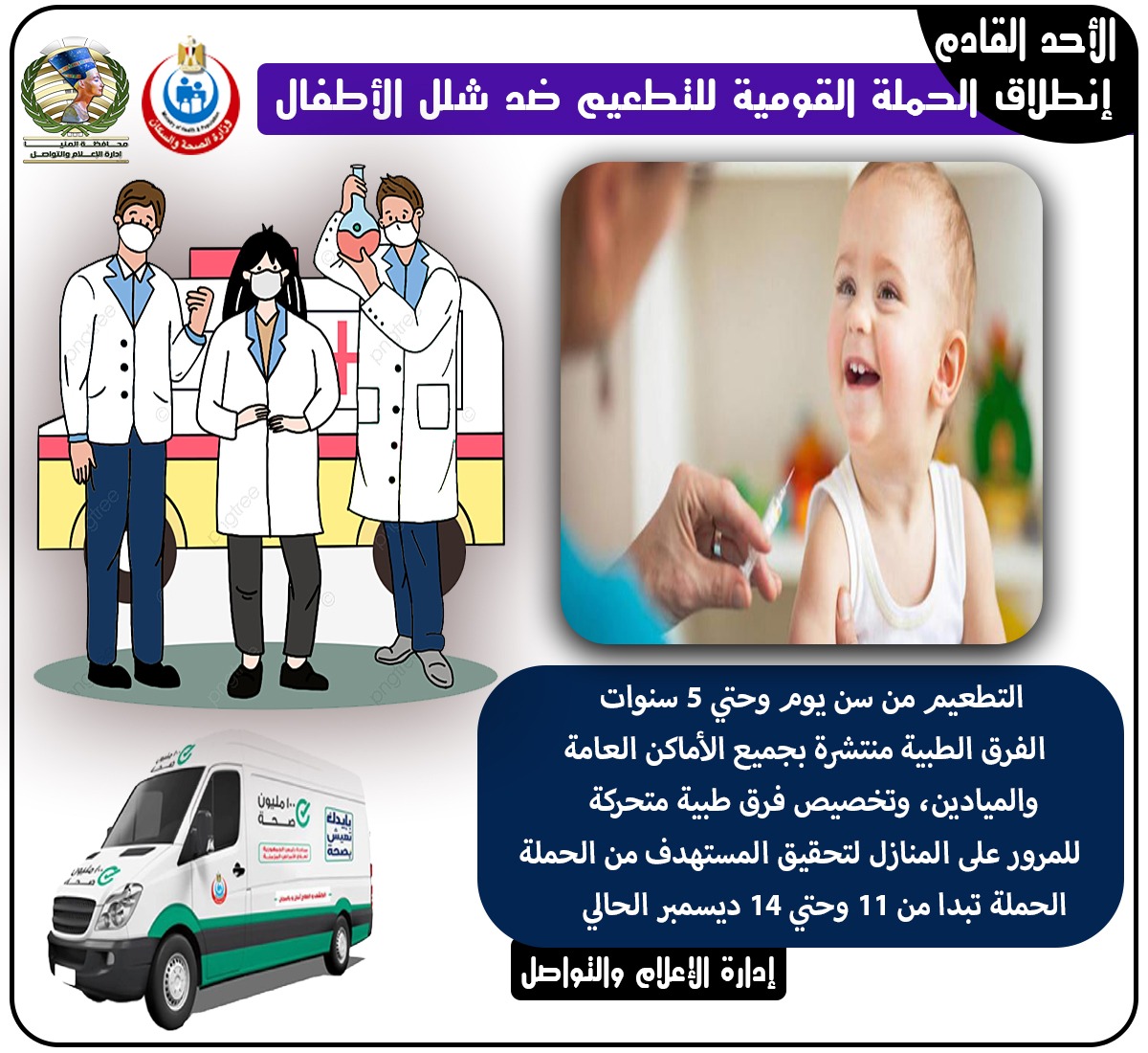 أعلنت مديرية الصحة بالمنيا، عن البدء غدا الأحد 11 ديسمبر في تنفيذ فعاليات الحملة القومية ضد مرض شلل الأطفال بالمجان، وذلك تنفيذًا لتوجيهات الدكتور خالد عبد الغفار وزير الصحة والسكان، وتحت رعاية اللواء أسامة القاضي محافظ المنيا، حيث تستهدف الحملة تطعيم الأطفال من سن يوم حتى 5 سنوات في الفترة من 11 وحتى 14 ديسمبر 2022.