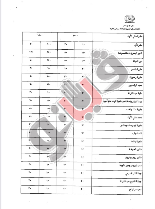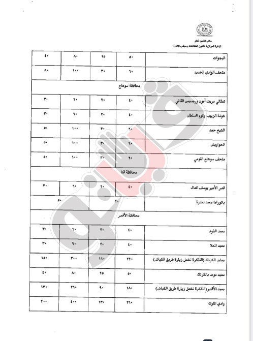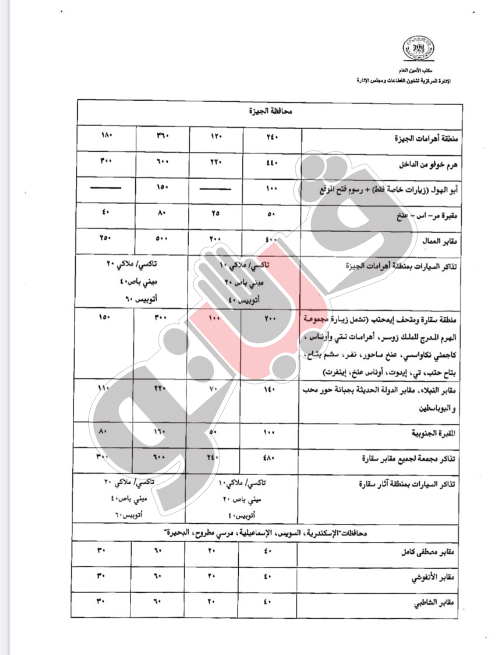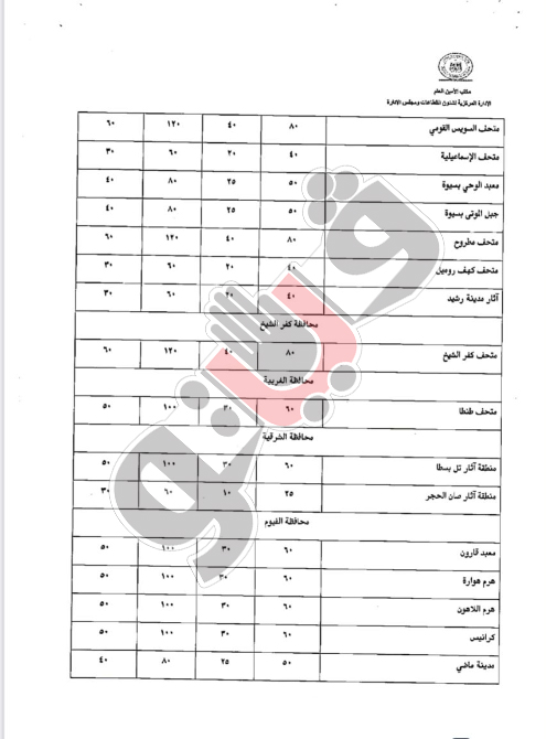 واوضح القرار انه سيتم زيادة اسعار دخول منطقة الاهرامات من 240 جنيها الي 360 للسائح الأجنبي ومن 120 الي 180 للطالب الأجنبي، وزيادة اسعار دخول من 260 جنيها الي ٤٠٠جنيها، وزيادة اسعار تذاكر دخول معبد الملكة حتشبسوت من 160 جنيها الي ٢٤٠جنيها، وزيادة اسعار تذاكر معابد الكرنك من 220 الي ٣٠٠ جنيها، وزيادة اسعار دخول معبد الاقصر الي ٢٦٠ جنيها، ومعبد ادفو الي ٣٠٠جنيها، ومعبد كوم امبو الي ٢٤٠ جنيها، ومعبد فيلة الي ٣٠٠ جنيها، والمسلة الناقصة الي ١٢٠ جنيها، وابوسمبل الي ٤٠٠ جنيها.
