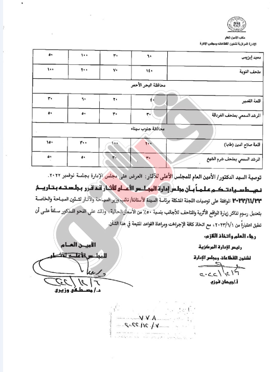 وأكد القرار، أن اللجنة تواصلت تليفونيا مع رئيس الاتحاد المصري للغرف السياحية والذي أفاد من جانبه بإمكانية زيادة أسعار دخول المواقع الآثرية والمتاحف في ظل التغيرات الاقتصادية الحالية.