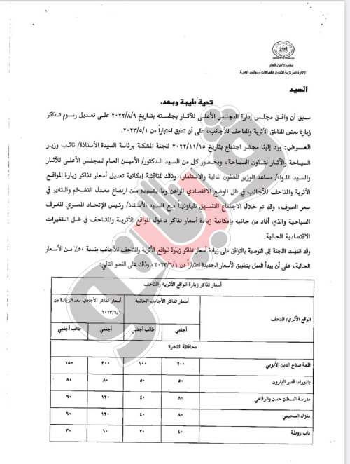 وأشار القرار إلي أن اللجنة انتهت الي التوصية بالتوافق علي زيادة اسعار تذاكر المواقع الآثرية والمتاحف للأجانب بنسبة 50% من الاسعار الحالية علي ان يبدأ العمل بتطبيق الأسعار الجديدة اعتبارًا من 1 /6/ 2023.
