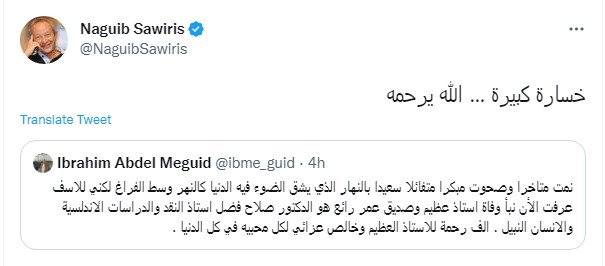 وكتب نجيب ساويرس تغريدة لوفاة الدكتور صلاح فضل قائلًا: " خسارة كبيرة … الله يرحمه".