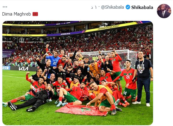 حرص شيكابالا نجم نادي الزمالك على الاحتفال بفوز المنتخب المغربي على البرتغال والصعود للدور قبل النهائي من منافسات كأس العالم على طريقته الخاصة حيث نشر صورة على صفحته الرسمية بتويتر وكتب عليها “ديما مغرب”.