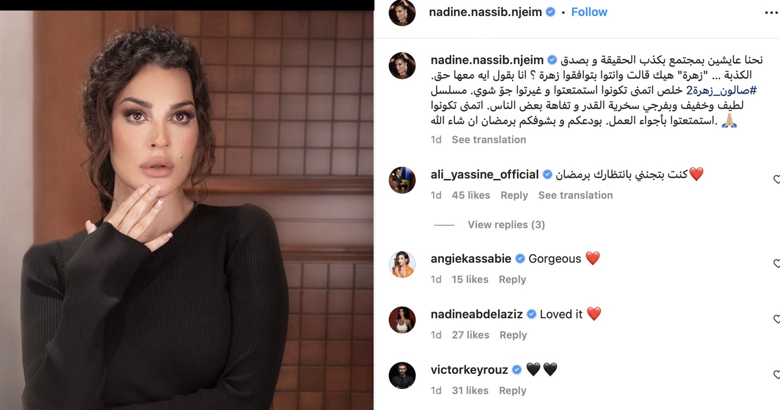 ودعت الفنانة اللبنانية نادين نسيب نجيم جمهور مسلسل صالون زهرة ٢ بعد انتهاء حلقاته مؤخرًا وذلك عبر حسابها الرسمي على موقع تبادل الصور إنستجرام ونشرت صورة لها وكتبت "نحنا عايشين بمجتمع بكذب الحقيقة وبصدق الكذبة … "زهرة" هيك قالت وانتوا بتوافقوا زهرة ؟ انا بقول ايه معها حق. #صالون_زهرة2 خلص اتمنى تكونوا استمتعتوا وغيرتوا جوّ شوي. مسلسل لطيف وخفيف وبفرجي سخرية القدر وتفاهة بعض الناس. اتمنى تكونوا استمتعتوا بأجواء العمل. بودعكم وبشوفكم برمضان ان شاء الله".