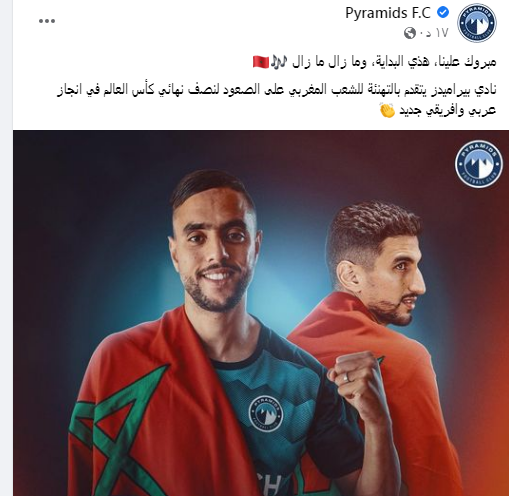 "مبروك علينا، هذي البداية، وما زال ما زال.. نادي بيراميدز يتقدم بالتهنئة للشعب المغربي على الصعود لنصف نهائي كأس العالم في إنجاز عربي وأفريقي جديد".