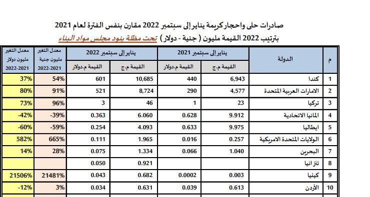 و شهدت صادرات الذهب والحلي والأحجار الكريمة ارتفاعًا خلال أول 9 أشهر من عام 2022 لتسجل 1.1 مليار دولار مقابل 839 مليون دولار خلال نفس الفترة من العام السابق،بنسبة نمو 34% مقارنة بنفس الفترة من عام 2021 وفقا لاحدث التقارير الصادرة عن المجلس التصديرى لمواد البناء وحصلت فـيـتو على نسخة منه.