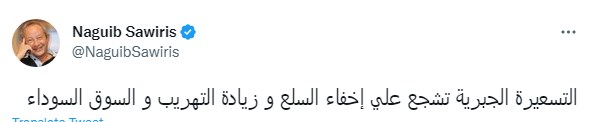 وكتب نجيب ساويرس تغريدة عبر تويتر قال فيها: "التسعيرة الجبرية تشجع على إخفاء السلع وزيادة التهريب والسوق السوداء".