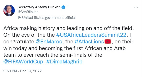 ونشر بلينكن، تغريدة على حسابه الرسمي، قال فيها:"إفريقيا تصنع التاريخ وتحتل الصدارة داخل الميدان وخارجه".