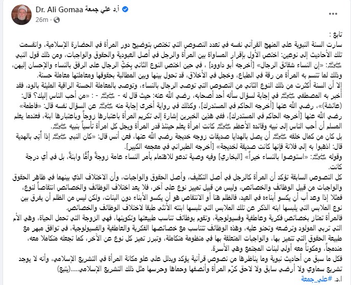 وكتب علي جمعة تدوينة على الفيس بوك "سارت السنة النبوية على المنهج القرآني نفسه في تعدد النصوص التي تختص بتوضيح دور المرأة في الحضارة الإسلامية، وانقسمت تلك الأحاديث إلى نوعين: اختص الأول بإقرار المساواة بين المرأة والرجل في أصل العبودية والحقوق والواجبات، ومن ذلك قول النبي ﷺ: «إن النساء شقائق الرجال» [أخرجه أبو داوود]