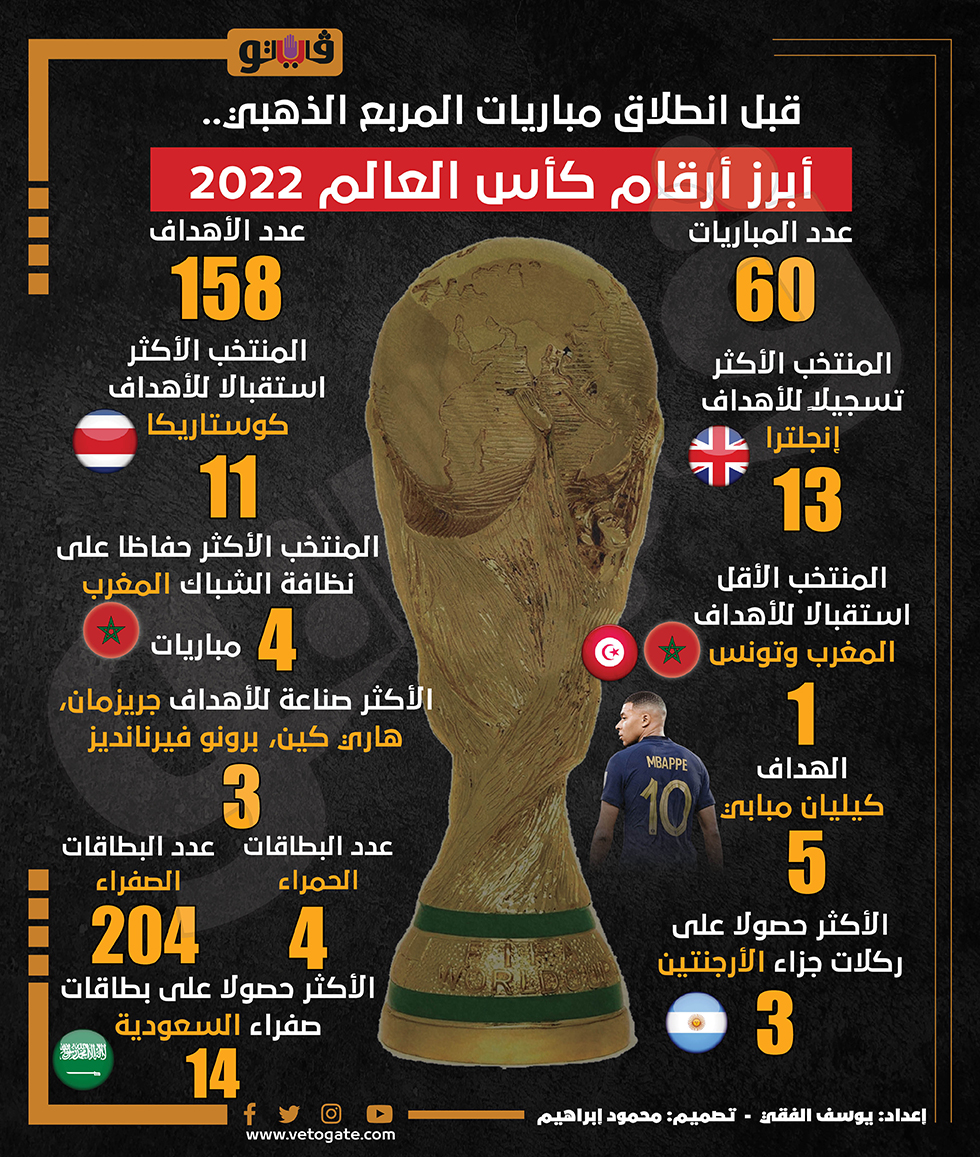 قبل انطلاق مباريات المربع الذهبي.. أبرز أرقام كأس العالم 2022 (انفوجراف) الثلاثاء 13/ديسمبر/2022 - 12:30 م 12/13/2022 12:30:46 PM المغرب، فيتو يوسف الفقي شارك طباعة 18 حجم الخط شارك طباعة كأس العالم كأس العالم 2022 المغرب المغرب وفرنسا كرواتيا والأرجنتين الأرجنتين وفرنسا