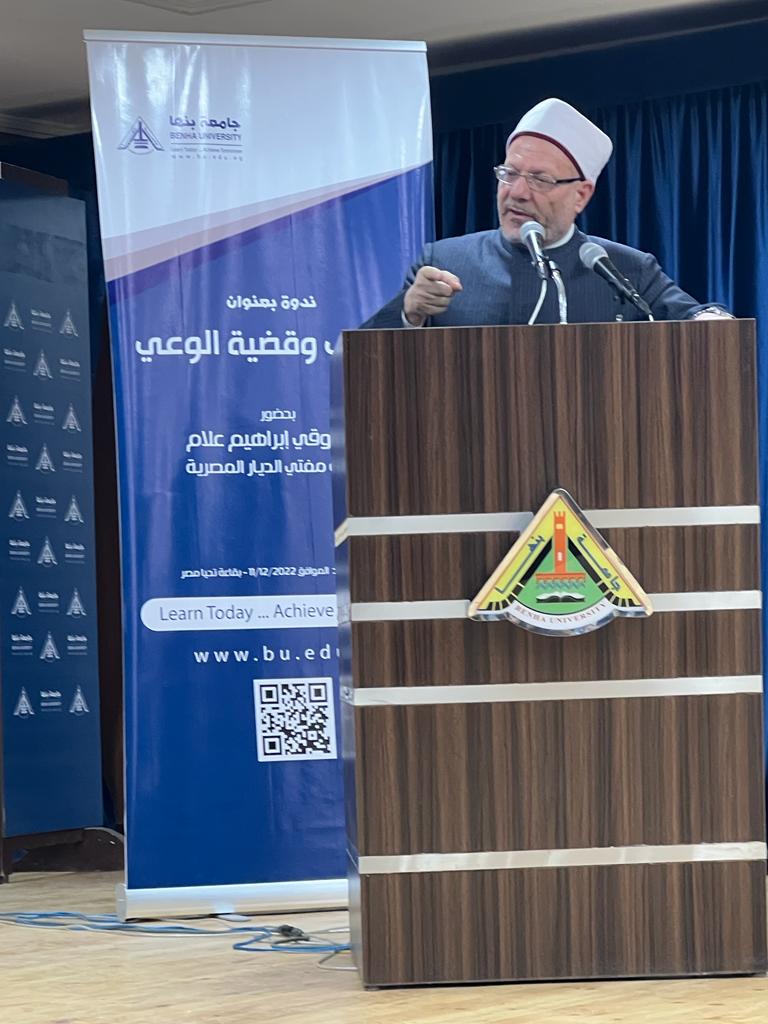 جاء ذلك خلال محاضرة فضيلة المفتي لطلاب جامعة بنها، بحضور الدكتور جمال سوسة رئيس جامعة بنها، واللواء عبد الحميد الهجان محافظ القليوبية، والتي تحدث فيها عن قضية الوعي، ودور الشباب في بناء المجتمعات.