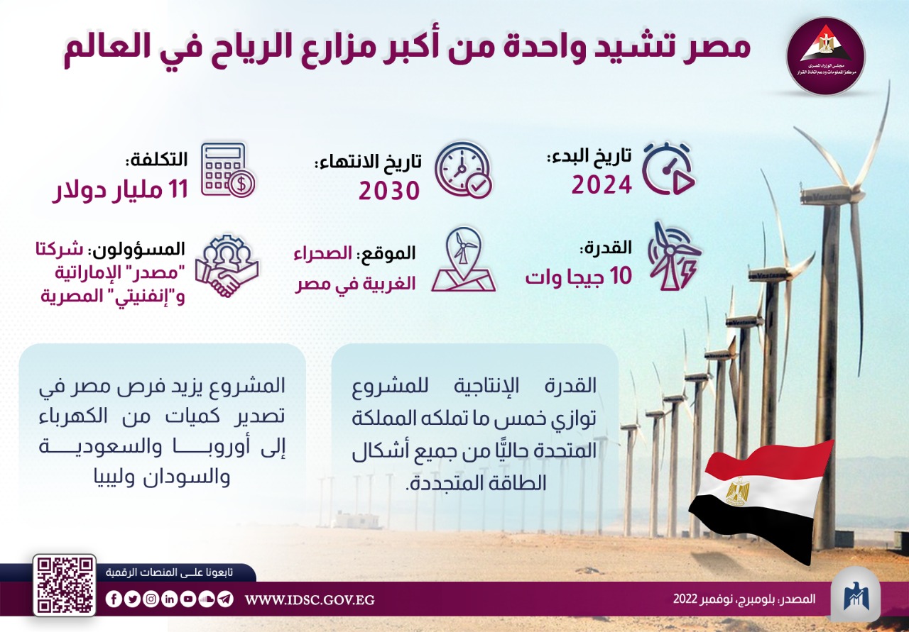 نشر مركز المعلومات ودعم اتخاذ القرار بمجلس الوزراء المصري إنفوجراف جديدا يتضمن أبرز المعلومات حول تشييد مصر واحدة من أكبر مزارع الرياح في العالم وفق أحد الاتفاقيات التي أبرمتها مصر متمثلة في شركة إنفينتي مع شركة مصدر الإماراتية خلال فعاليات قمة المناخ COP 27.