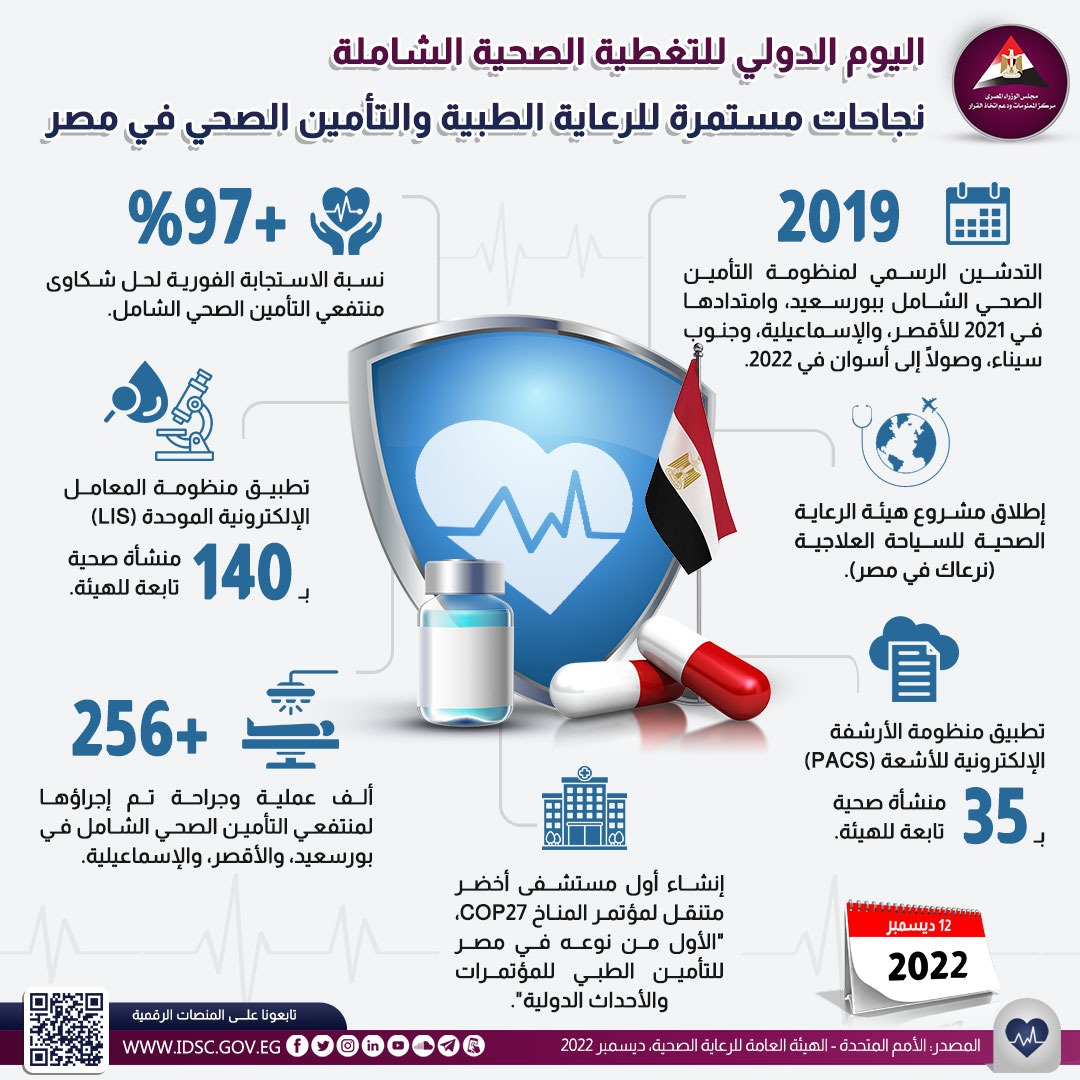 نشر مركز معلومات مجلس الوزراء إنفوجراف جديدا تحت عنوان: "نجاحات مستمرة للرعاية الطبية والتأمين الصحي في مصر"، وذلك في إطار احتفال العالم باليوم الدولي للتغطية الصحية الشاملة والموافق 12 من ديسمبر كل عام.