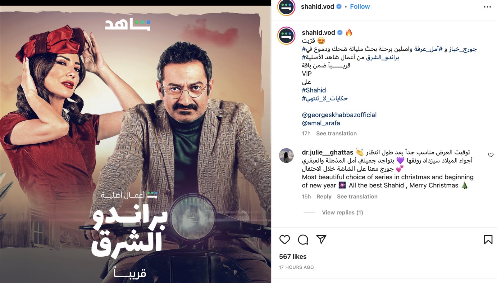 روجت منصة شاهد vip لأحدث أعمال الفنان جورج خباز وهو مسلسل براندو الشرق حيث نشر الحساب الرسمي للمنصة عبر موقع تبادل الصور إنستجرام بوستر المسلسل مصحوبًا بتعليق “قرّبت.. جورج خباز وأمل عرفة واصلين برحلة بحث مليانة ضحك ودموع في براندو الشرق من أعمال شاهد الأصلية قريـــــــبًا”.