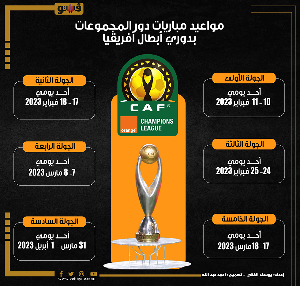 مواعيد مباريات دور المجموعات بدوري أبطال أفريقيا (إنفوجراف) الإثنين 12/ديسمبر/2022 - 03:39 م 12/12/2022 3:39:41 PM يوسف الفقي شارك طباعة 18 حجم الخط شارك طباعة