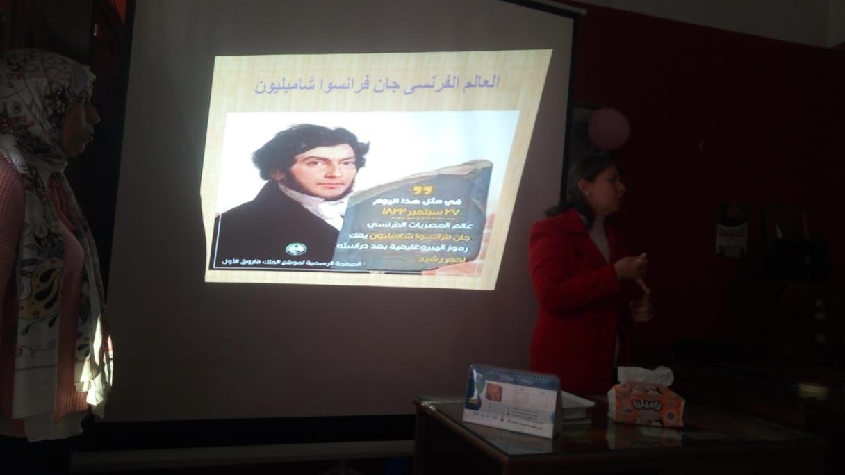 كما القت مديرة ادارة الوعى الاثري الضوء على اهمية هرم اللاهون بين الماضي والحاضر وقصر قارون واهميتة كما تناولت المحاضرة ايضا فقرة عن فك رموز الكتابة علي حجر رشيد وتأسيس علم المصريات.