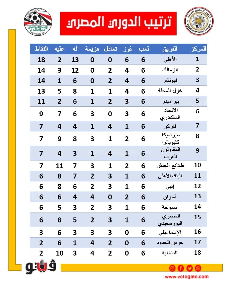 تنشر فيتو جدول ترتيب الدوري الممتاز لكرة القدم بعد انتهاء المباريات المؤجلة والتي أقيم يومي الأحد والاثنين واختتمت بمواجهة الأهلي والاتحاد السكندري.