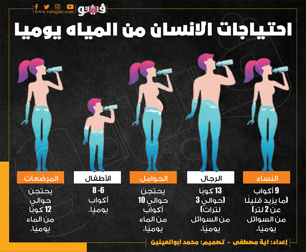 احتياجات الإنسان من المياه يوميا (إنفوجراف) الجمعة 03/مارس/2023 - 09:04 م 3/3/2023 9:04:46 PM شرب الماء، فيتو آية مصطفى شارك طباعة 18 حجم الخط شارك طباعة المرضعات المرأة الحامل انفوجراف الرجال الأطفال