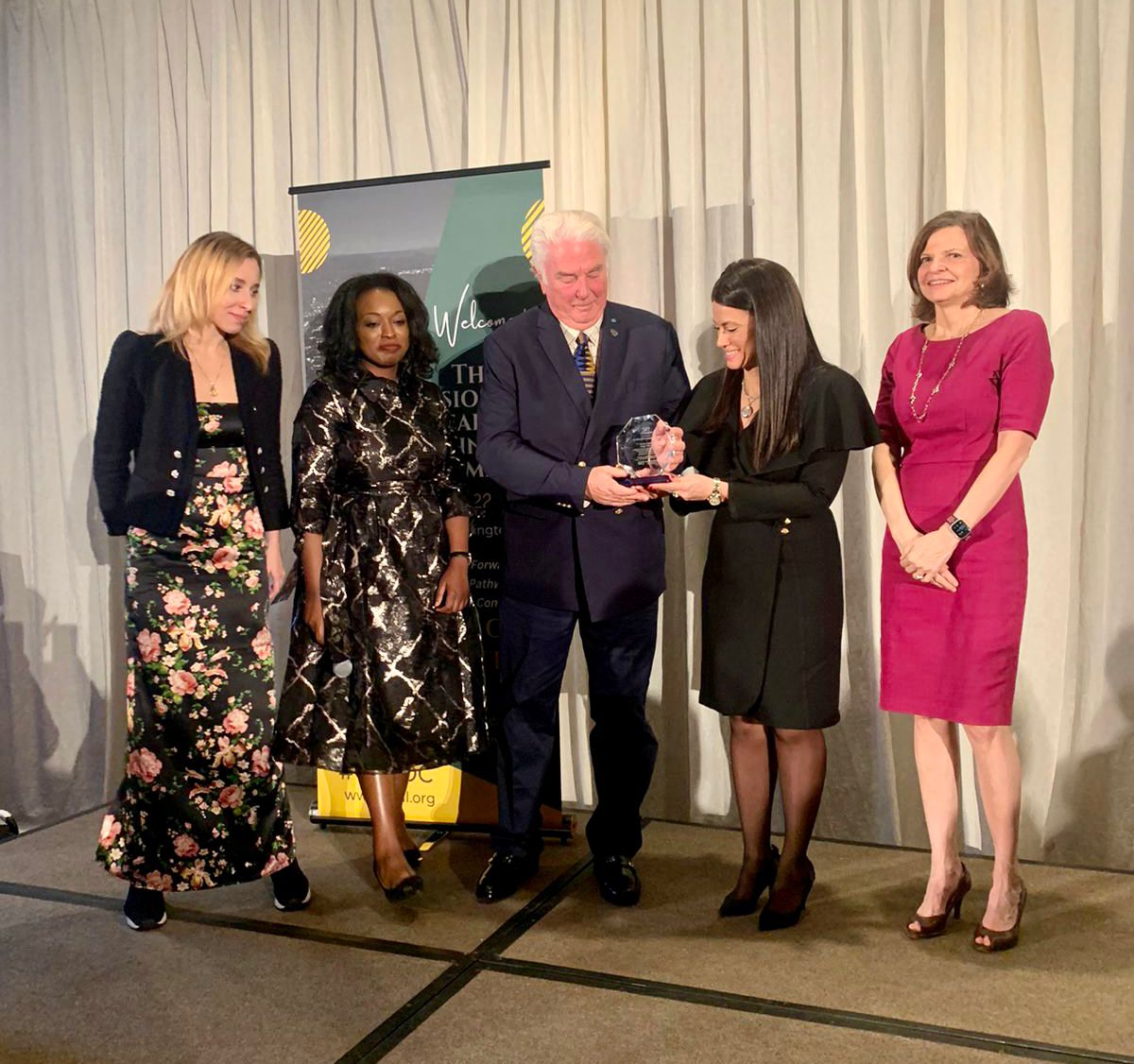 وقدمت الجائزة جينفير كوك، رئيس معهد الدراسات الأفريقية بجامعة جورج واشنطن بحضور إيمي سار فار رئيس ومؤسسة مبادرة GE7، والعديد من ممثلي مؤسسات التمويل الدولية من بينهم مجموعة البنك الدولي والبنك الأفريقي للتصدير والاستيراد وبنك التنمية الأفريقي والوكالة الأمريكية للتنمية الدولية والبنك العربي للتنمية الاقتصادية في أفريقيا، إلى جانب الطلبة والباحثين بكبرى الجامعات الأمريكية وممثلي الحكومة الأمريكية وغرفة التجارة الأمريكية وغيرهم.