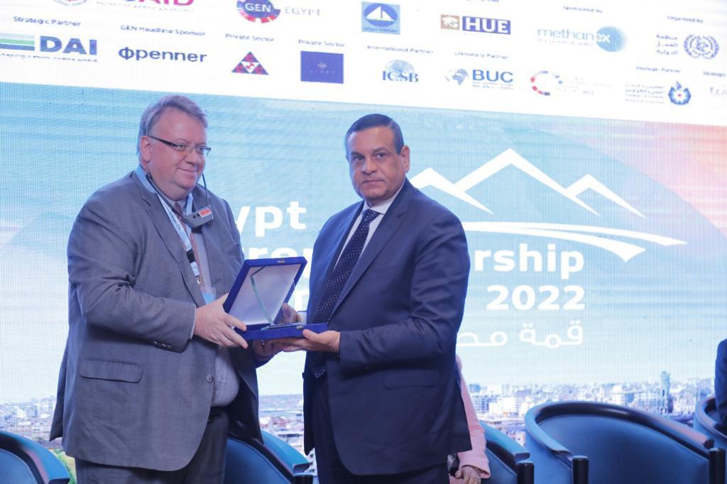 وشهد المؤتمر الإعلان عن استمرار شركة ميثانكس في تنفيذ البرنامج خلال السنوات القادمة وتقديم المتسابقين لأفكارهم ومشروعاتهم، تسلم اللواء هشام آمنة والدكتورة منال عوض وممثلي الجهات المشاركة دروعا تذكارية قدمها لهم ايريك اوشلان مدير مكتب منظمة العمل الدولية بالقاهرة.