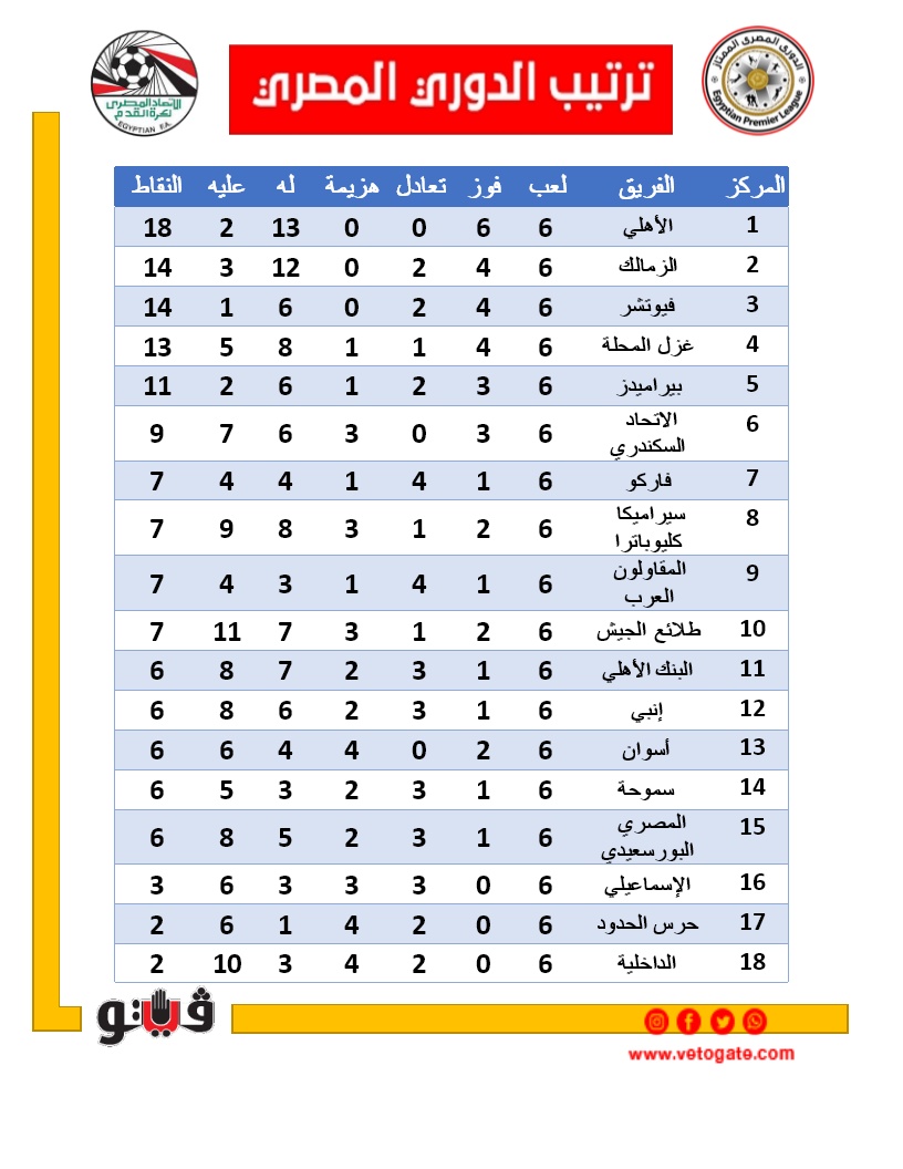يتصدر النادي الأهلي جدول ترتيب الدوري الممتاز بعد انتهاء الجولة السادسة وقبل بداية الجولة السابعة للبطولة المقرر انطلاقها غدا الأربعاء بمواجهة غزل المحلة وطلائع الجيش.