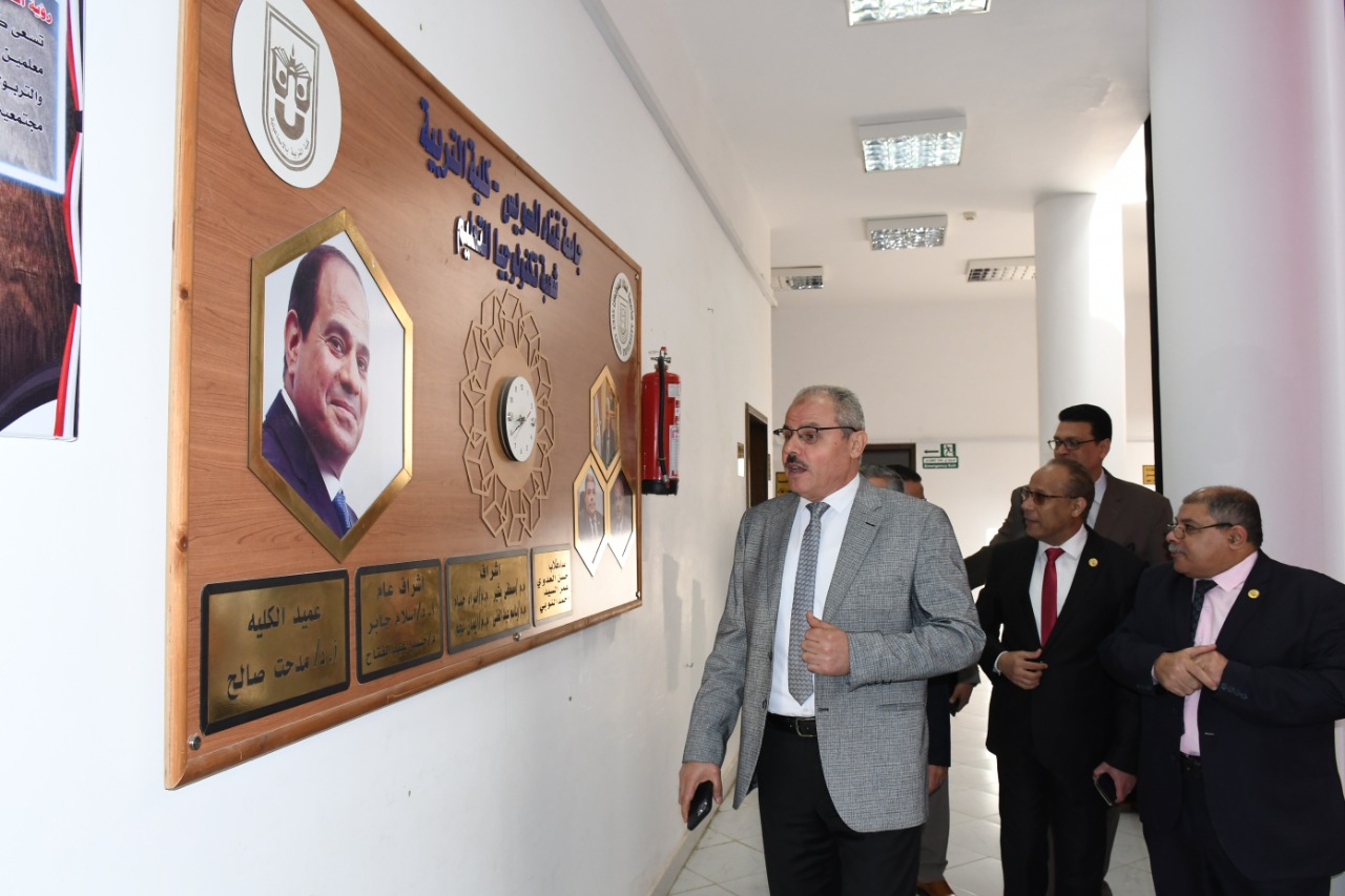 وكان فى إستقبال رئيس الجامعة ومرافقيه الدكتور مدحت صالح عميد كلية التربية والدكتور مجدى الحبشى وكيل الكلية لشئون الدراسات العليا والبحوث والدكتور حسام جمال الدين وكيل الكلية لشئون خدمة المجتمع وتنمية البيئة والدكتورة حنان محمود وكيل الكلية لشئون التعليم والطلاب واساتذة الكلية ورؤساء الأقسام والهيئة المعاونة والعاملين.