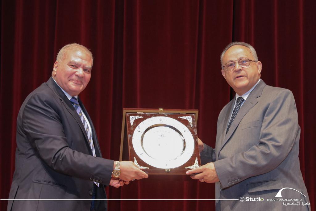 و قام المهندس محمد سعيد أحمد رئيس مجلس إدارة الكشافة البحرية المصرية بتسليم درع الكشافة للدكتور أحمد زايد وقدم شكره للمكتبة لإتاحة الفرصة للمشاركة في مثل هذا اليوم وقدم الشكر للجميع على مجهوداتهم والاسهام في ادخال السرور علي أبنائنا لأنهم أبطال بمعني الكلمة.