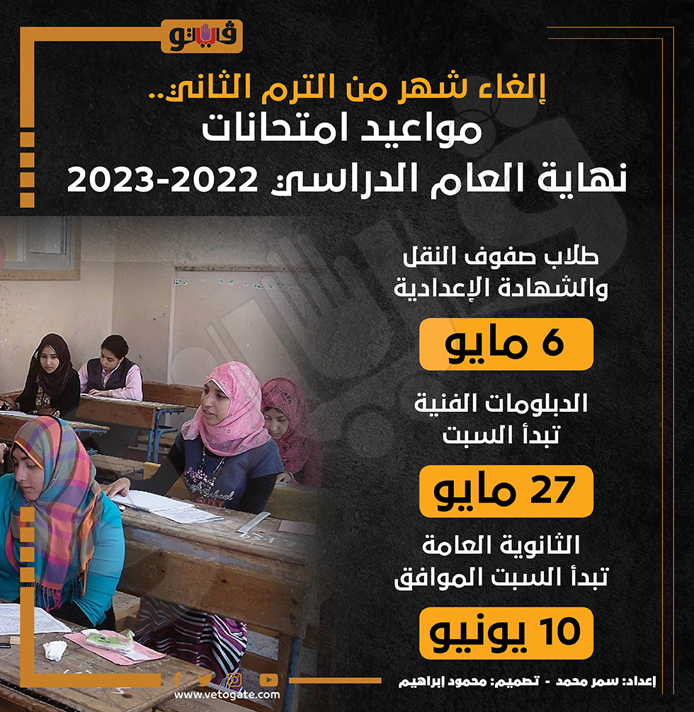 إلغاء شهر من الترم الثاني، مواعيد امتحانات نهاية العام الدراسي 2022-2023 (انفو جراف) الثلاثاء 13/ديسمبر/2022 - 08:33 م 12/13/2022 8:33:47 PM امتحانات نهاية العام، فيتو سمر محمد شارك طباعة 18 حجم الخط شارك طباعة أمتحانات نهاية العام الدراسي الشهادة الاعدادية امتحانات شهادة الثانوية العامة امتحانات الدبلومات الفنية