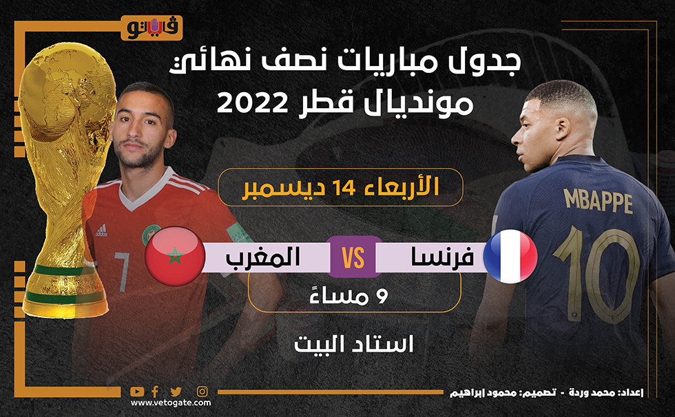 موعد مباراة فرنسا والمغرب اليوم في كأس العالم 2022 الأربعاء 14/ديسمبر/2022 - 11:09 ص 12/14/2022 11:09:15 AM موعد مباراة فرنسا والمغرب في كأس العالم، فيتو شارك طباعة 18 حجم الخط شارك طباعة مباراة فرنسا والمغرب كأس العالم 2022 مباراة فرنسا كأس العالم فرنسا والمغرب